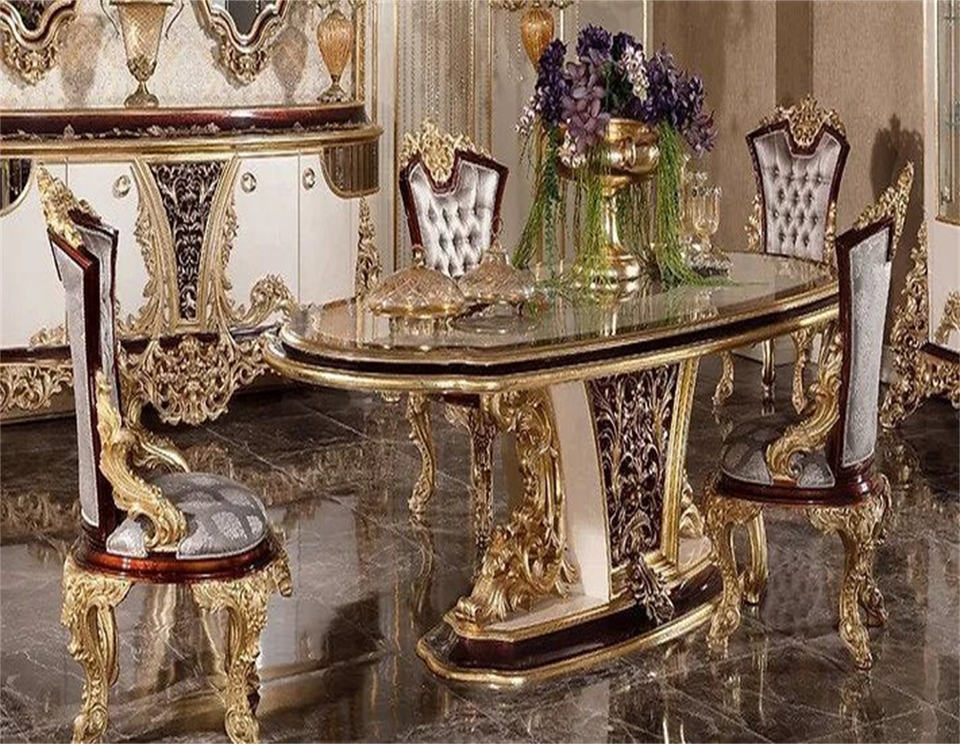 Set per Sala da Pranzo in Stile Classico Europeo di Lusso Intagliato a Mano con Tavolo e Sedie in Stile Barocco a Doppio Intaglio