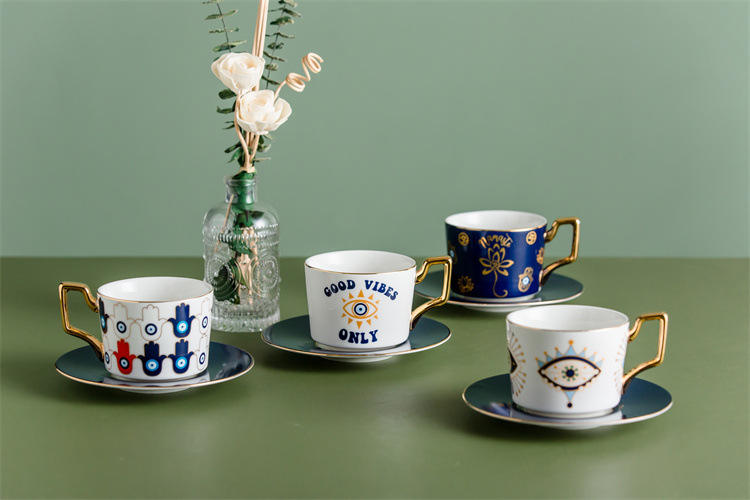 Set di Tazze da Caffè Europee con Piattino, Serie Occhio, Manico Dorato, Occhi Malvagi, in Ceramica