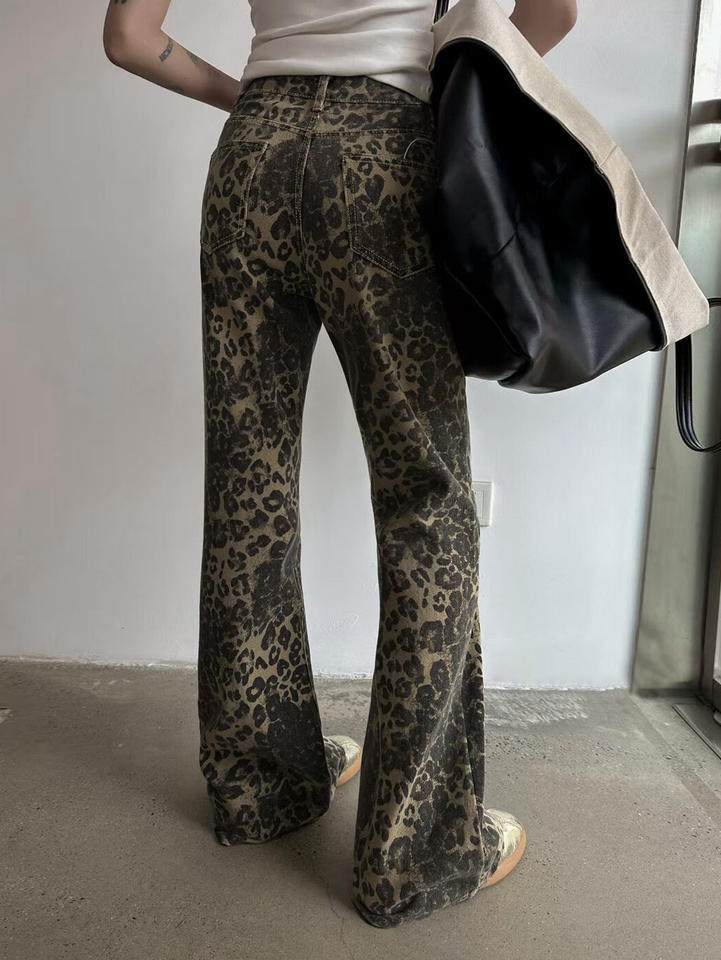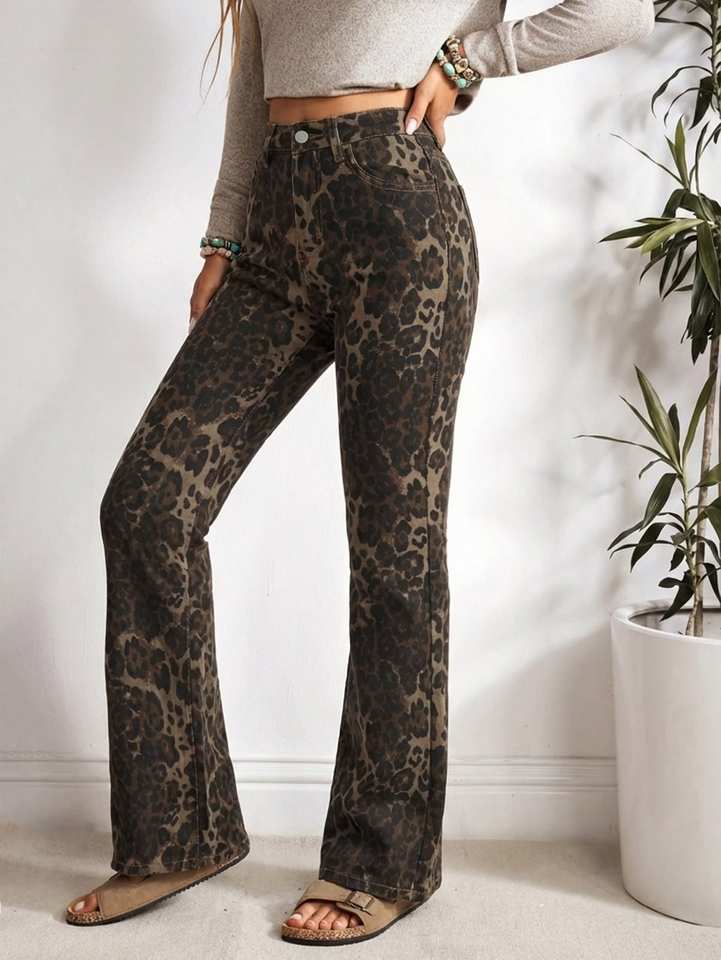 Pantaloni a Zampa Larghi Casual con Stampa Leopardata Elasticizzati Lavati Stile Europeo per Donna XL Commercio Transfrontaliero Traspiranti con Bottoni