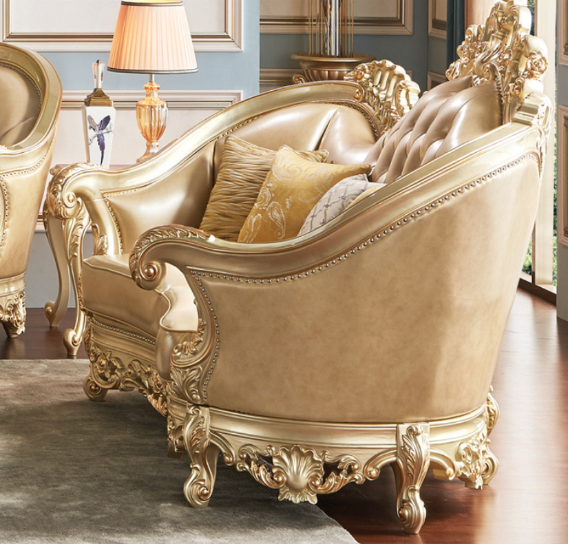 Divano Combinato in Pelle e Legno Massello Intagliato di Lusso Europeo Color Champagne, Arredamento per Soggiorno in Stile Francese
