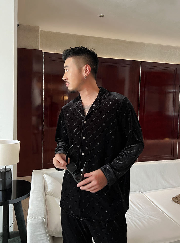 Pigiama in Velluto Europeo, Adatto per Uomo e Donna, Completo Nero con Catena di Diamanti, Maniche Lunghe e Pantaloni di Qualità
