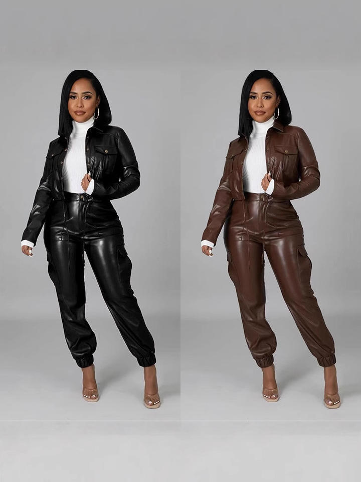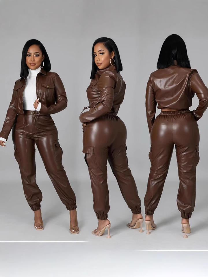 European and American Autumn Women's Casual PU Leather Jacket Trousers Suit Solid Style Skinny Fit Multi-Pocket
