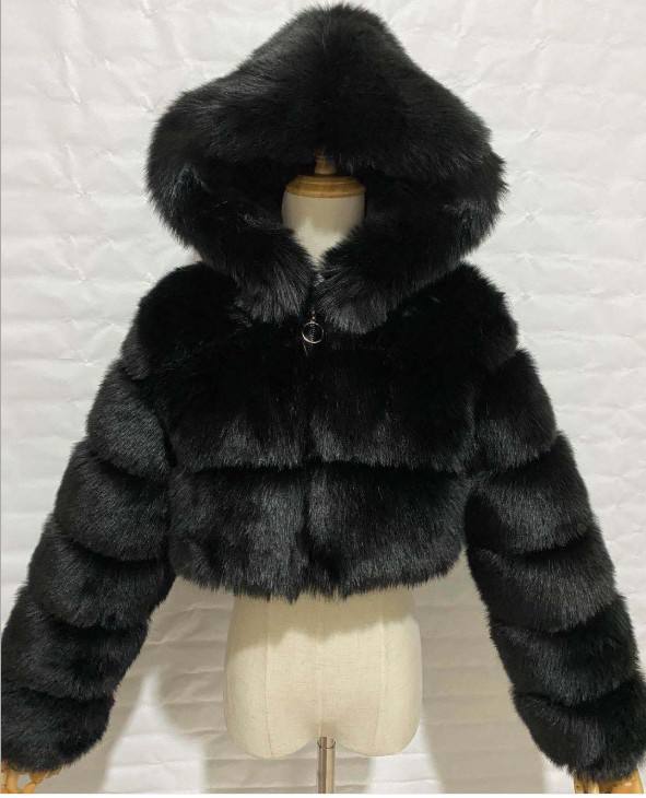 European and American Fur Coat Women's Short Hooded Splicing Fur Like Coat Fox Fur Long Sleeve Splicing Coat