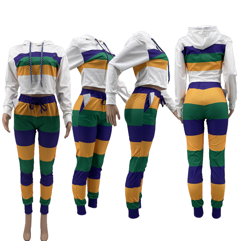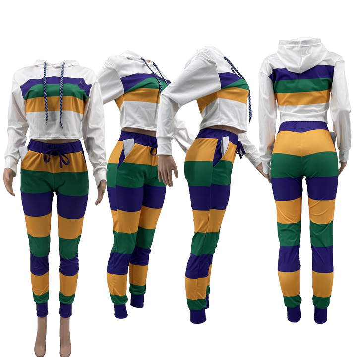 European and American Leisure Sport Stripe Placement Print Two-Piece Set Casual Hooded Top and Short Knitting Fabric Bottoms