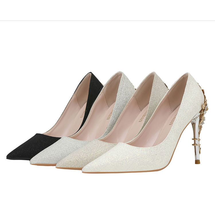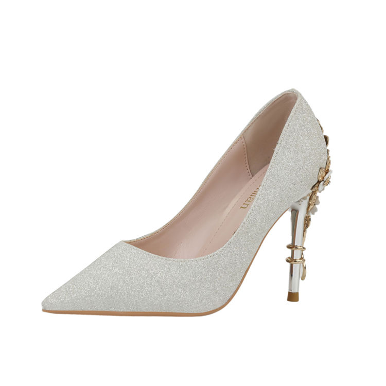 European and American Light Luxury Sexy Metal Flower Thin Heel High Heel Pointed Shiny Gold Powder Women's Single Shoes
