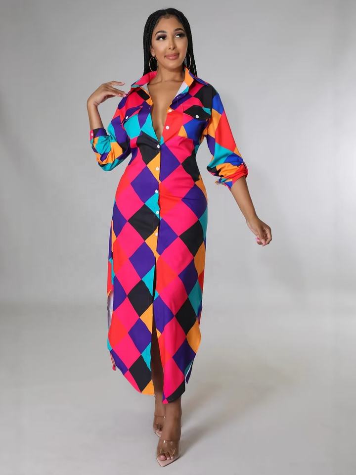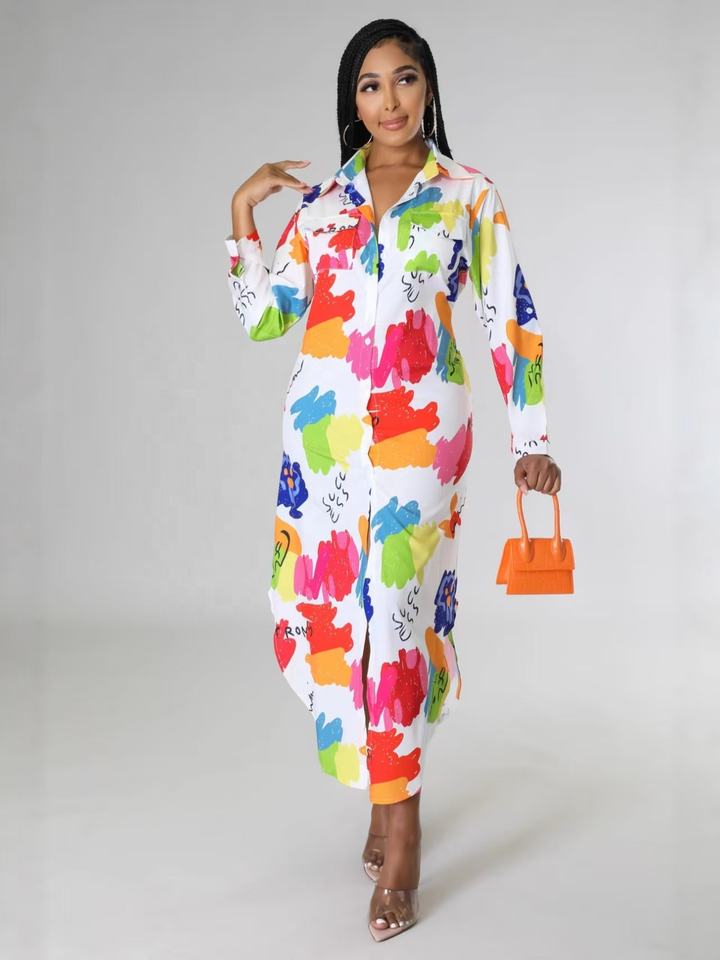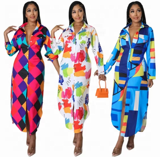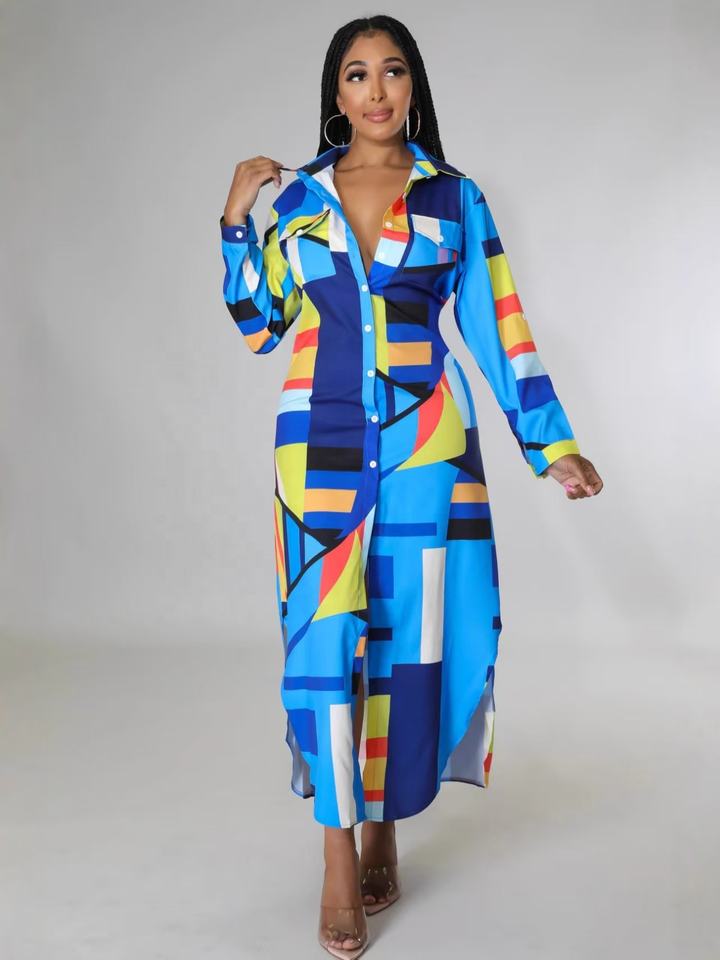 European and American Style Polo Collar Trendy Casual Beach-themed Irregular Long-sleeved Shirt-style Dress