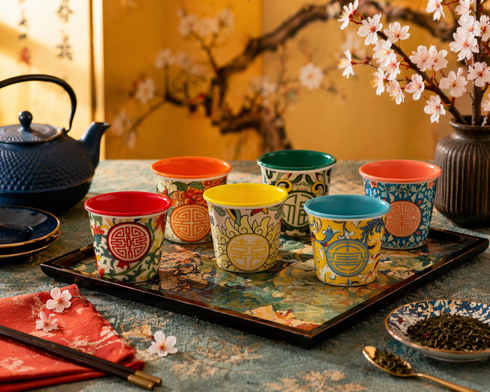 Durable New Bone China Set of 6 Espresso Coffee Cups 9 cl (3 fl oz) Decal Technique Oriental Design Japanese Theme by Excelsa