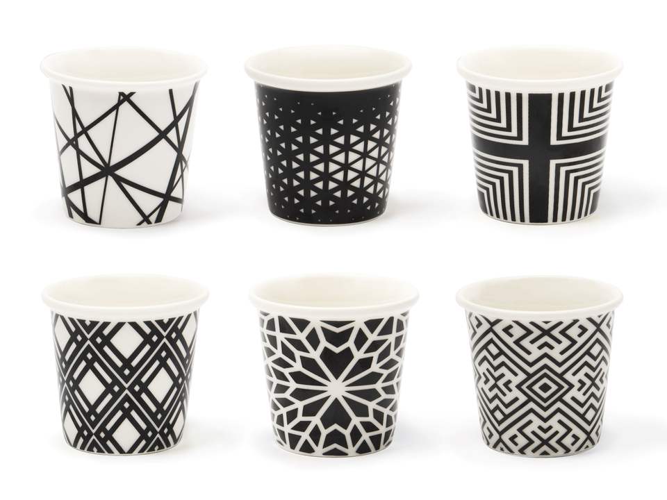 Set di 6 tazzine da caffè espresso in New Bone China resistente, 9 cl (3 fl oz), design geometrico bianco e nero Emily di Excelsa