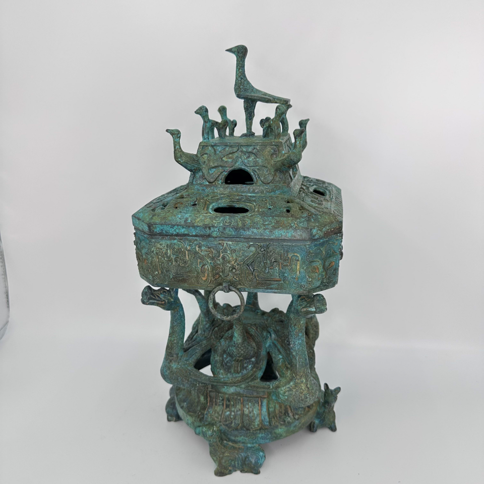 Exquisite Ancient Chinese Bronze Incense Burner Four Dragons Four Phoenixes Practical Artistic Metal Craft Warring States Period
