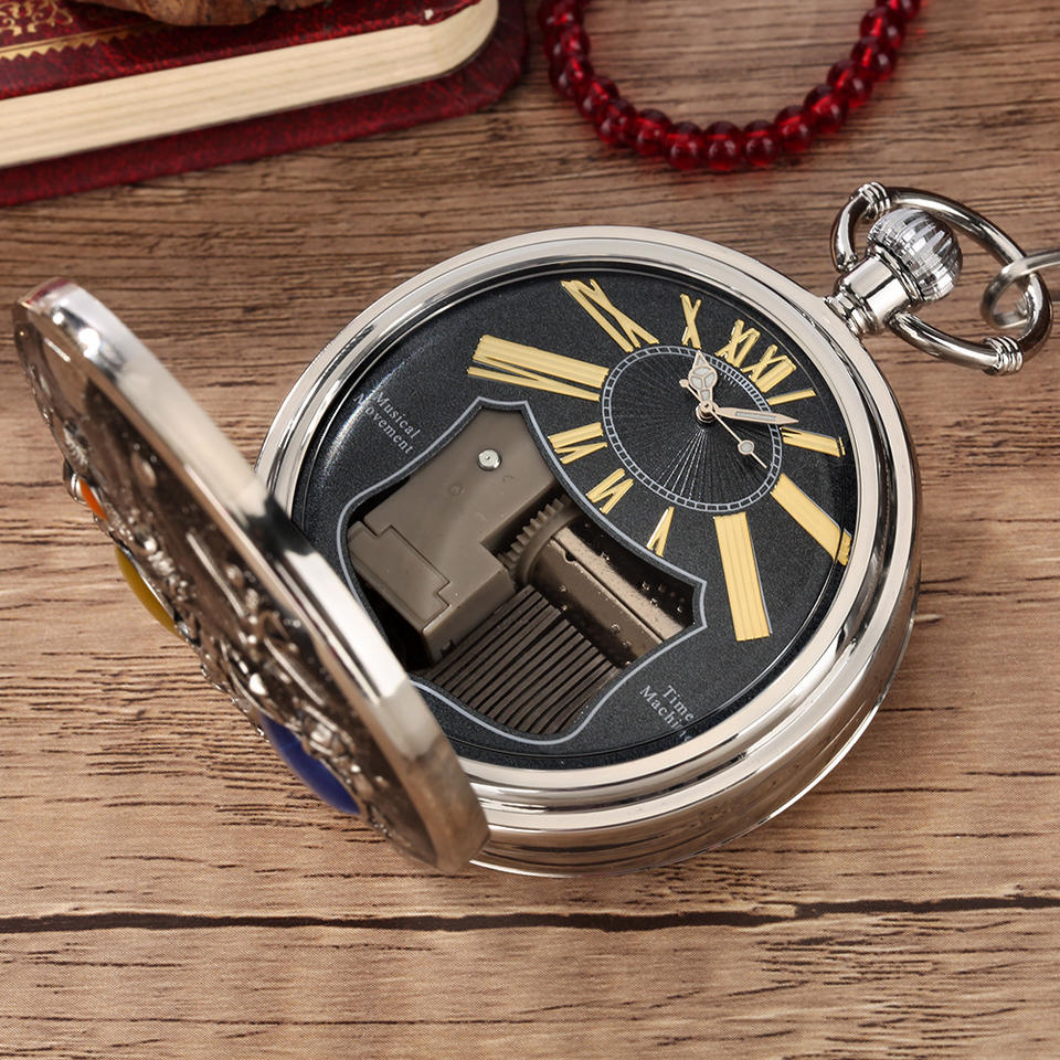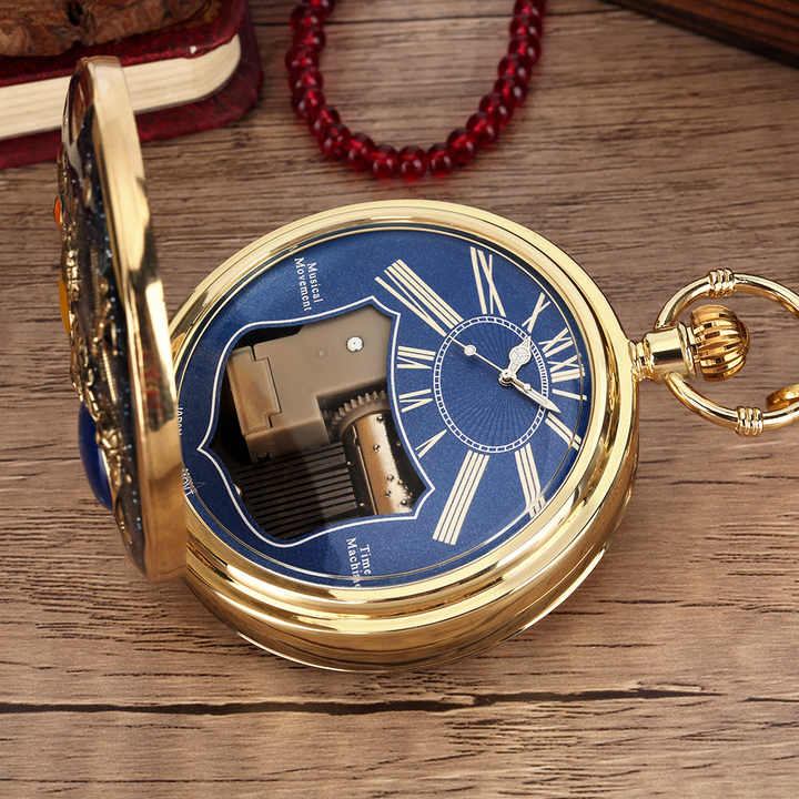 Orologio da Tasca in Quarzo Dorato Squisito con Carica Manuale, Riproduzione Musicale, Catena e Numeri Romani Incisi, Stile Antico, Non Impermeabile - Buon Anno Nuovo