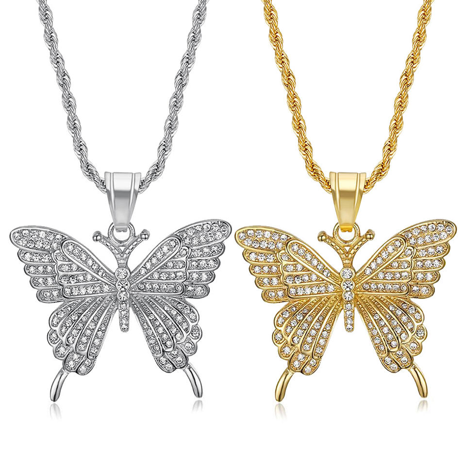 Collana Raffinata con Dettaglio Ali di Farfalla 3D Incastonate di Zirconi Cubici, Finitura Dorata Lucida e Texture Resistente