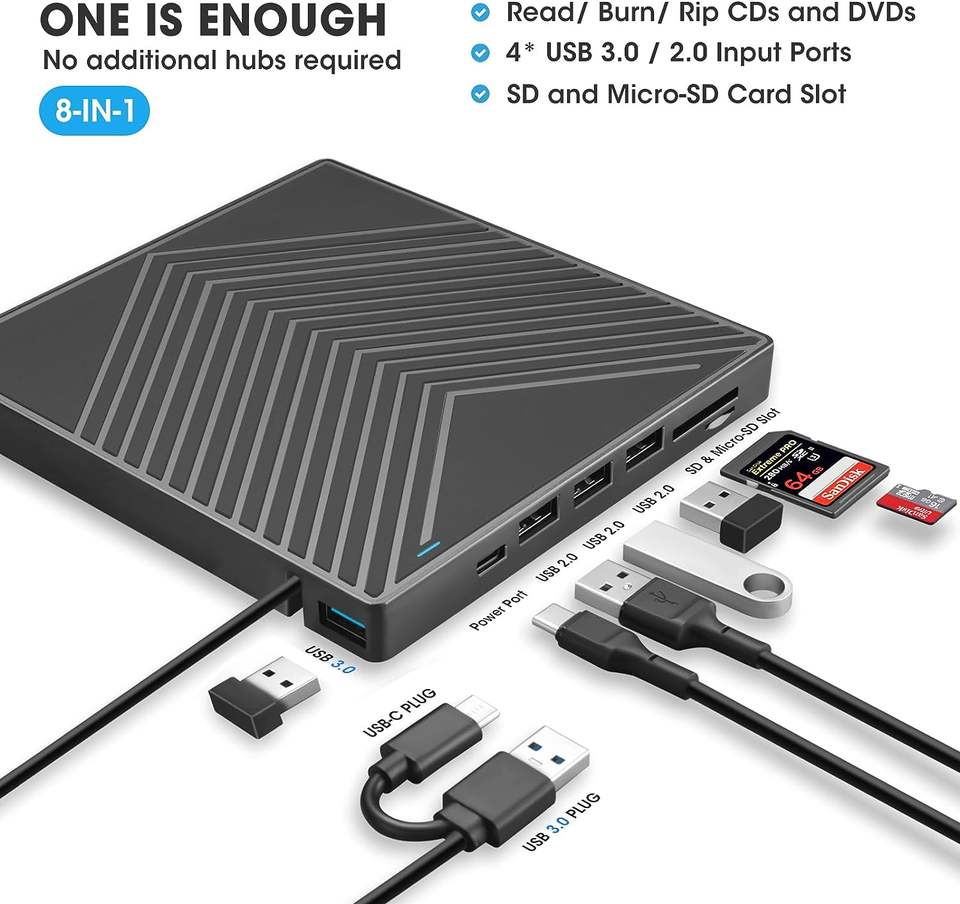 Unità CD DVD+/-RW Esterna con Lettore di Schede SD e Porte USB, Masterizzatore e Lettore CD ROM DVD USB 3.0 USB-C per Laptop e PC