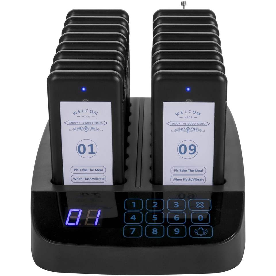 Sistema di Chiamata Wireless F101 per Ristoranti, 16 Pager Max, 98 Segnalatori Acustici, Tastiera Touch, Vibrazione, Luce Lampeggiante, per Hotel e Servizi