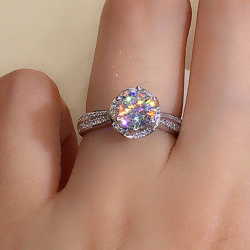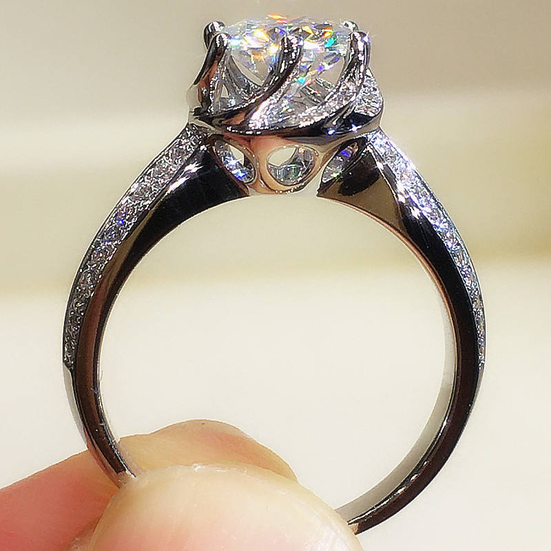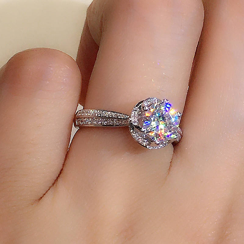 F1295 Women's White Gold Diamond Engagement Ring Round Brilliant Cut Natural D Color Side Diamonds