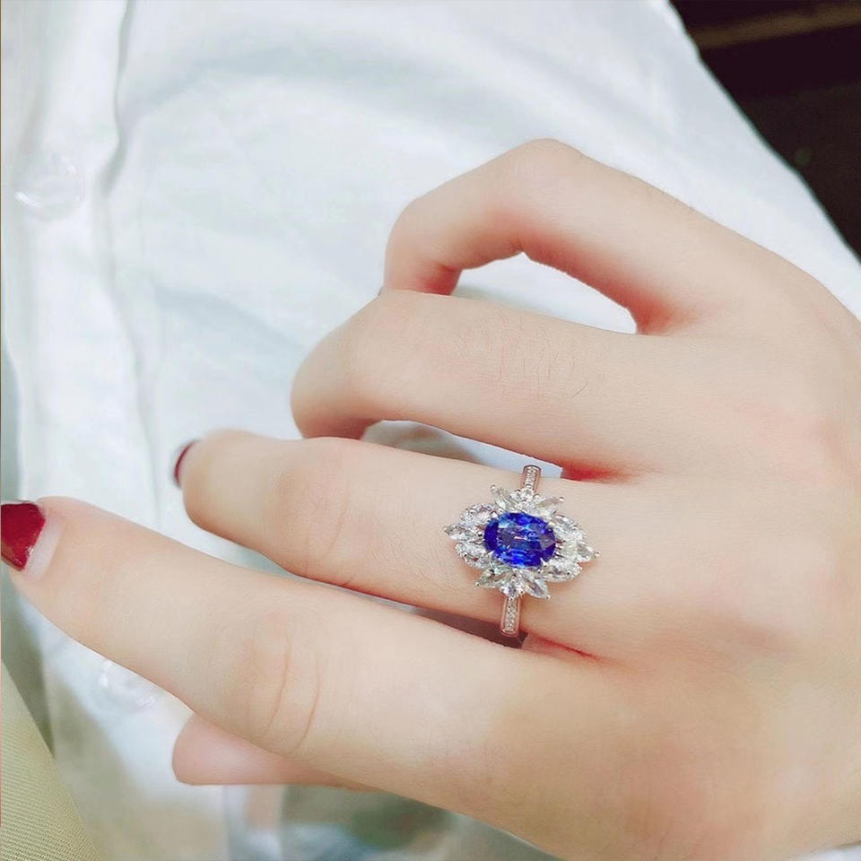 Anello da Cocktail F1493 con Fiore, in Oro Massiccio 18K, Zaffiro Centrale, Diamanti Taglio Marquise, Montatura a Griffe, Anello di Fidanzamento da Donna