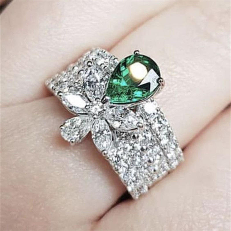 Anello Cocktail F1789 con Fiore in Oro Bianco, Moissanite Taglio a Pera, Incastonatura a Pavé, Gioiello da Festa per Donne