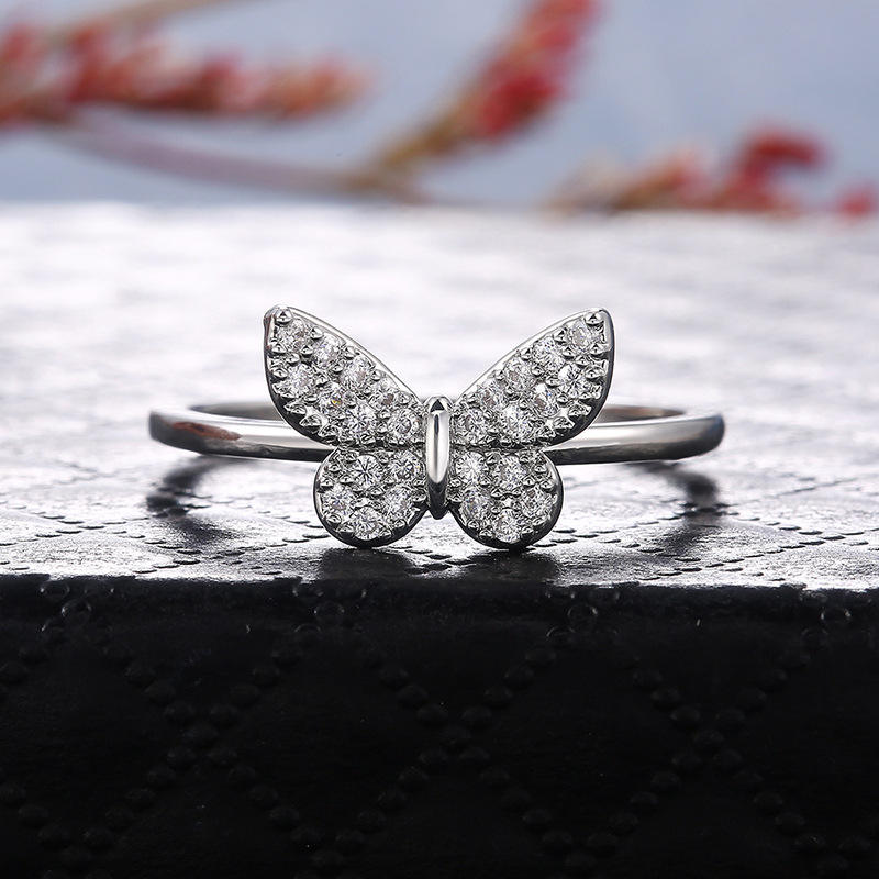 F583 Butterfly Diamond Ring Silver Women's Cute Everyday Wear Round Brilliant Cut Natural G Color Main Stone
