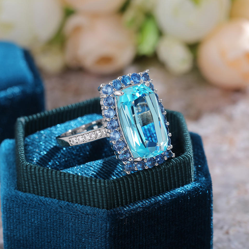F664 Women's Emerald Cut Topaz Ring Crystal Rhinestone Pave Setting Geometric Engagement Jewelry