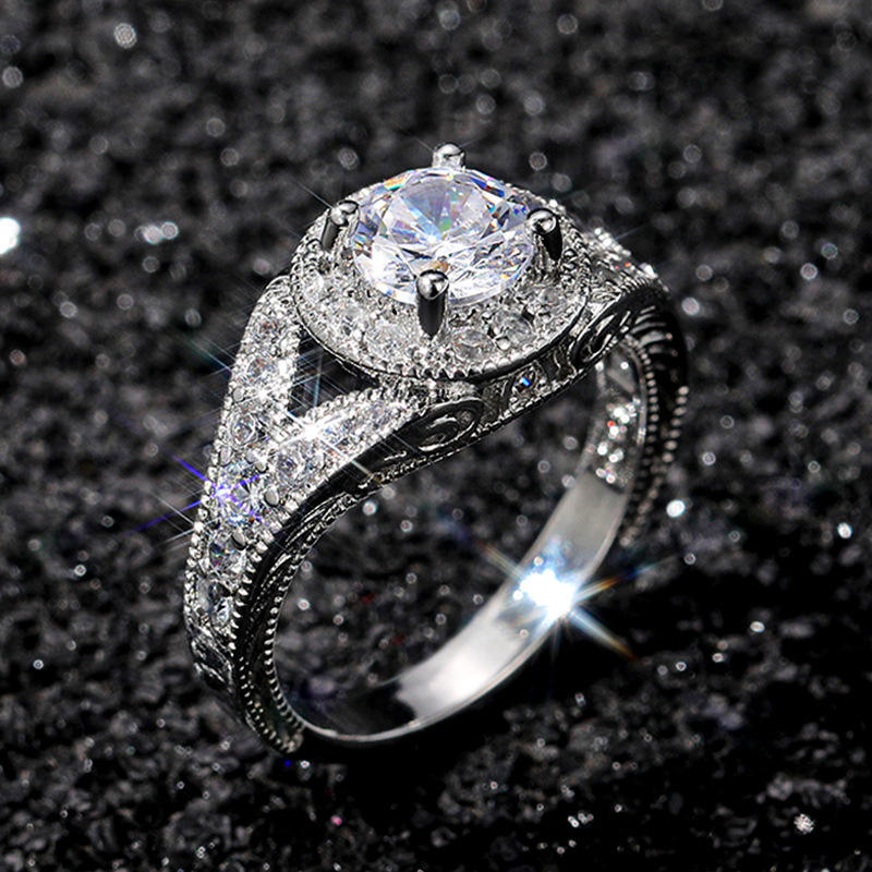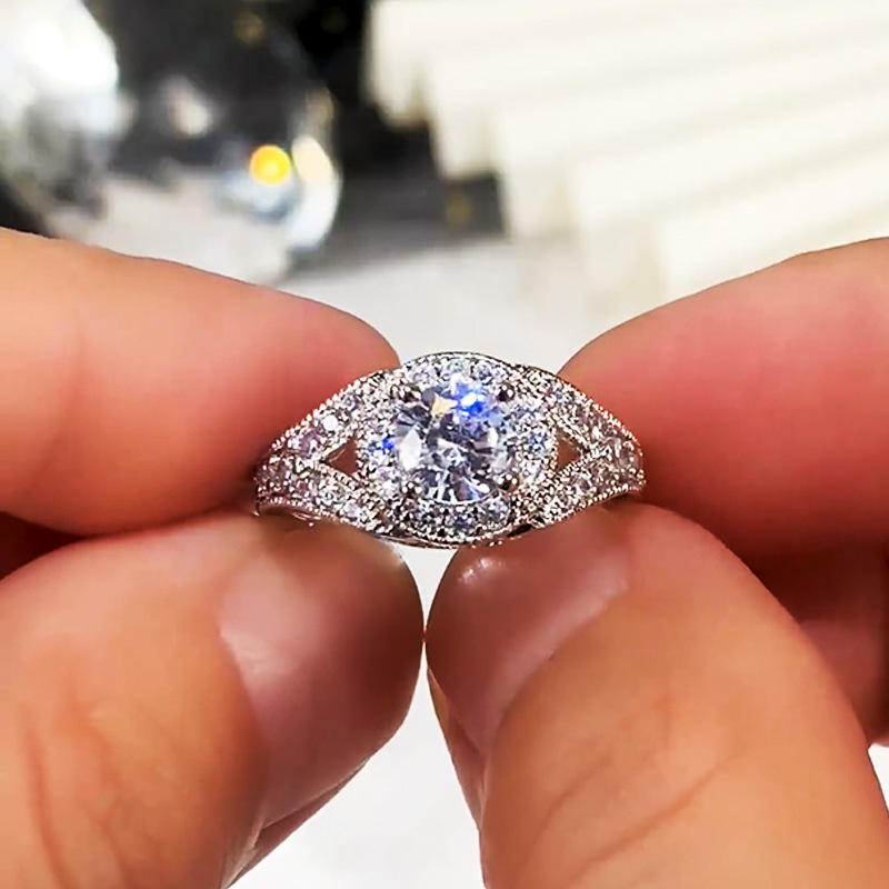 F768 Women's White Gold Diamond Engagement Ring Round Brilliant Cut Natural G Color Halo Design