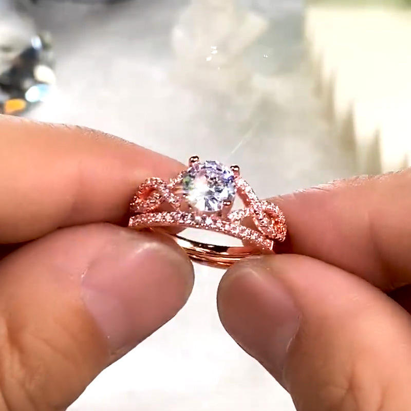 F817 Women's Rose Gold Diamond Engagement Ring Round Brilliant Cut Synthetic Lab Grown Diamond Band With Side Stones