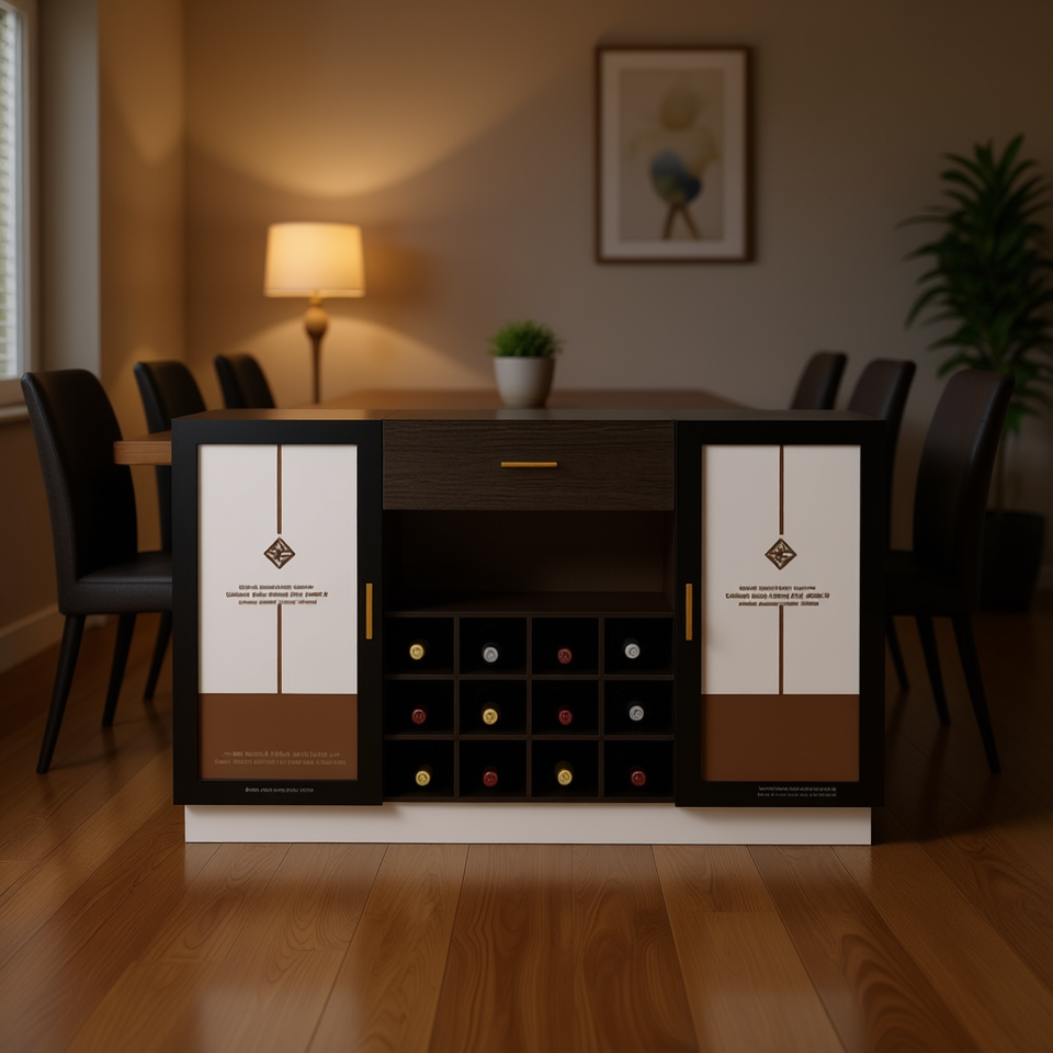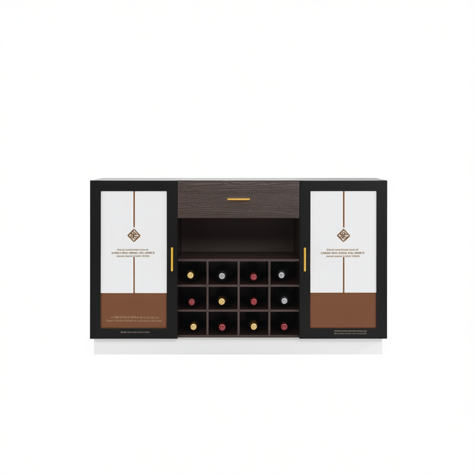 Credenza Portabottiglie FCH per 12 Bottiglie con Doppia Porta in Vetro, Cassetto Singolo, Telaio Nero, Pannelli Interni Bianchi e Marroni, Design Moderno