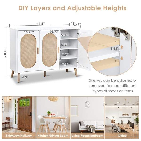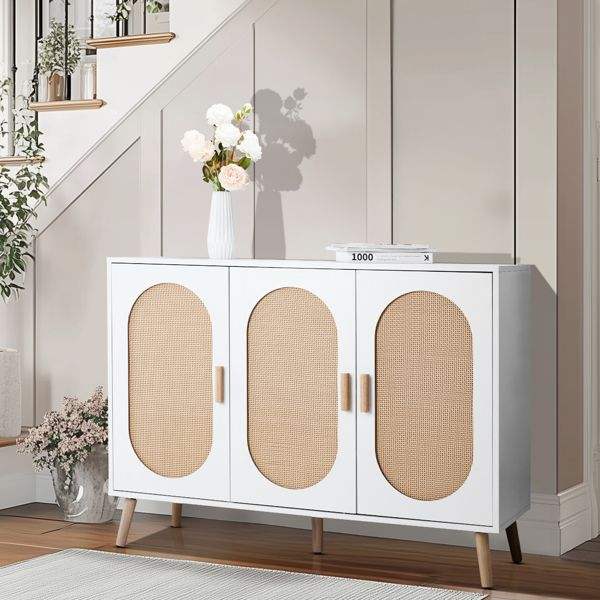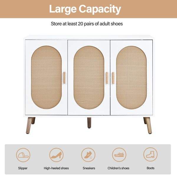 FCH 3-Door Vertical Shoe Cabinet White Frame with Particle Board Plastic Rattan Original Wood Rattan Surface Gold High Feet