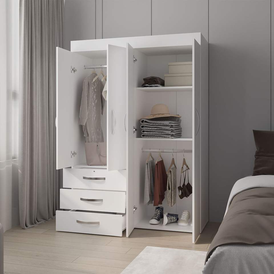 FM FURNITURE Laurens 4-Door White Wardrobe with Multistorage Drawers and Shelves Spacious Design