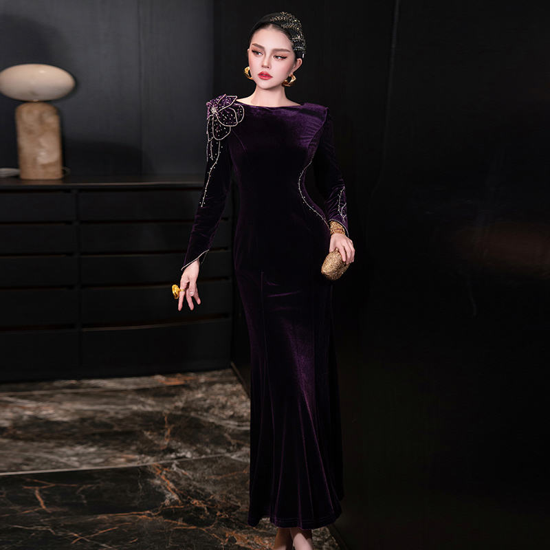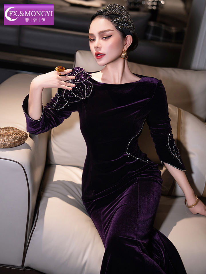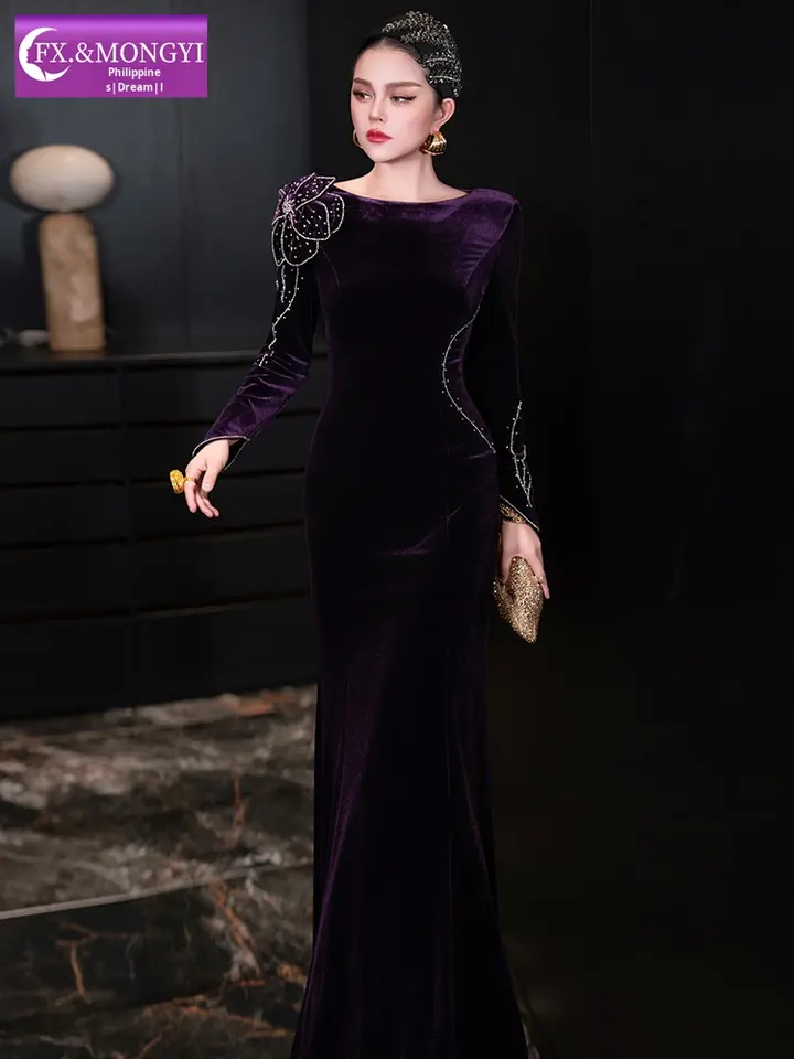 FMY Abito in velluto rosso e viola con perline per donna, maniche lunghe, elegante autunno e inverno, abito da banchetto e da festa 66584