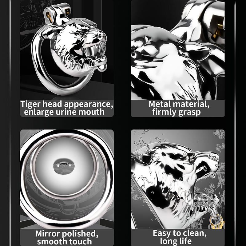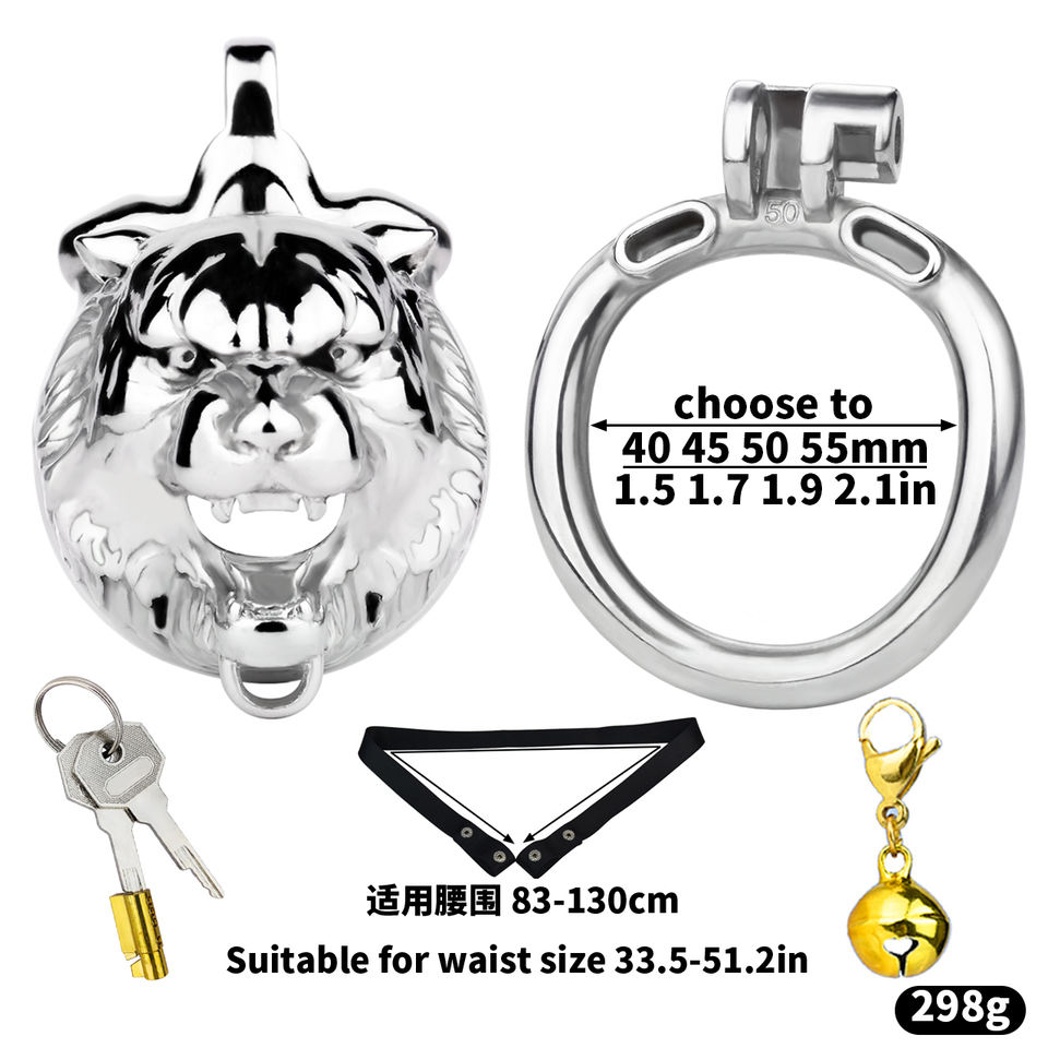 FRRK Tiger Head Male Chastity Lock Strap-on Beast Series Cage with Bell Man Penis Restriction Stainless Steel Chastity Cage