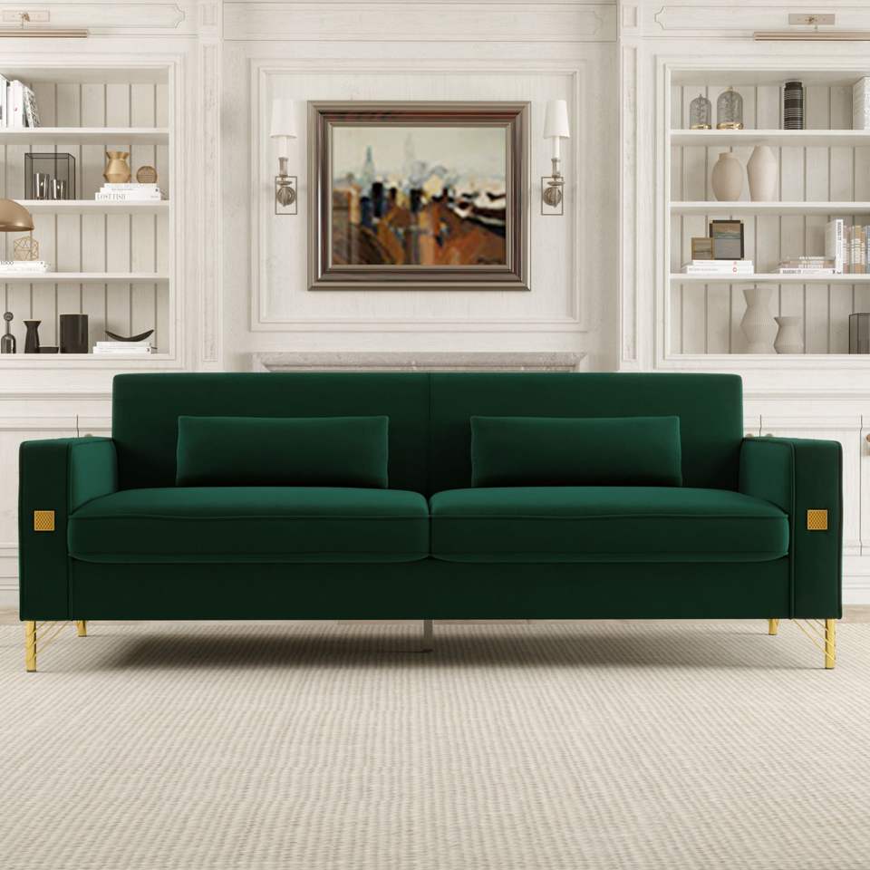 FX P18 RG2(SOFA) Divano di Lusso a 3 Posti in Velluto Verde Smeraldo con Dettagli Dorati, Divano Moderno per Soggiorno con Cuscini Morbidi