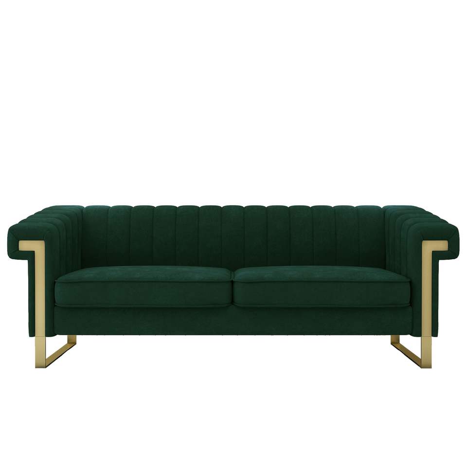 Divano Moderno FX P81 RG2 Retro Verde a 3 Posti in Velluto Crema con Elegante Trapuntatura a Canali e Dettagli Dorati per Soggiorno