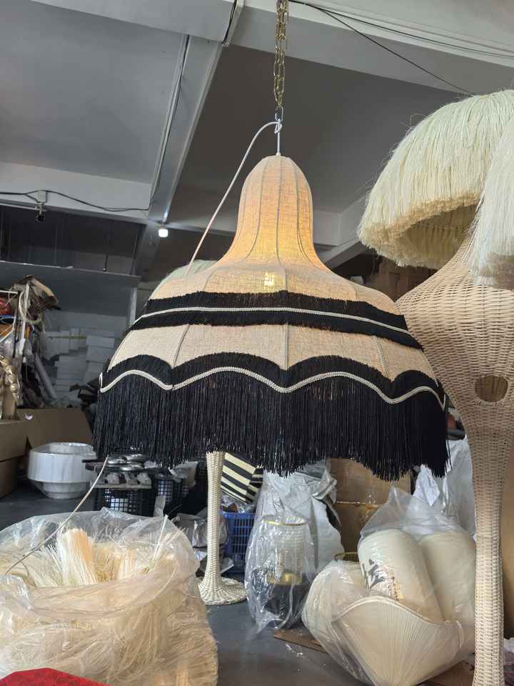 Lampada a Sospensione con Paralume in Tessuto e Nappe, Lampada Pendente con Frange Colore Beige, Luci Decorative per Matrimoni con Frange Nere