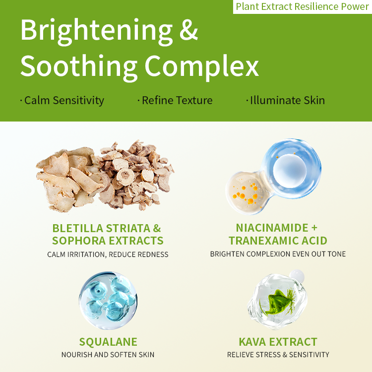 Ceramide EOP, Ceramide NP, Ceramide AP, Fibronectin, Ectoine, Niacinamide, Tranexamic Acid, Trehalose, Squalane, Bletilla Striata, Sophora Extracts