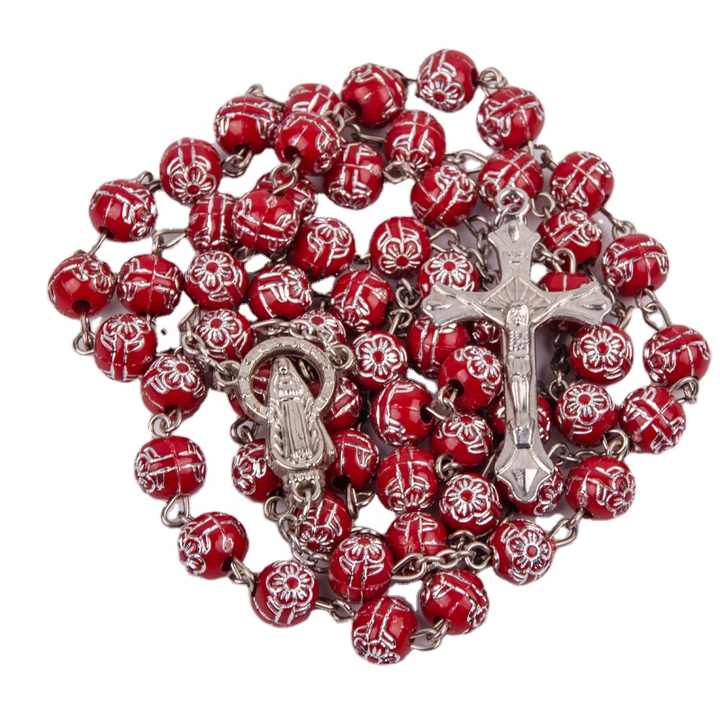 Fabbrica 8 millimetri Rosso di plastica del branello del fiore della Rosa Intagliato Cattolica Argento Crocifisso collana Del Rosario per la Preghiera