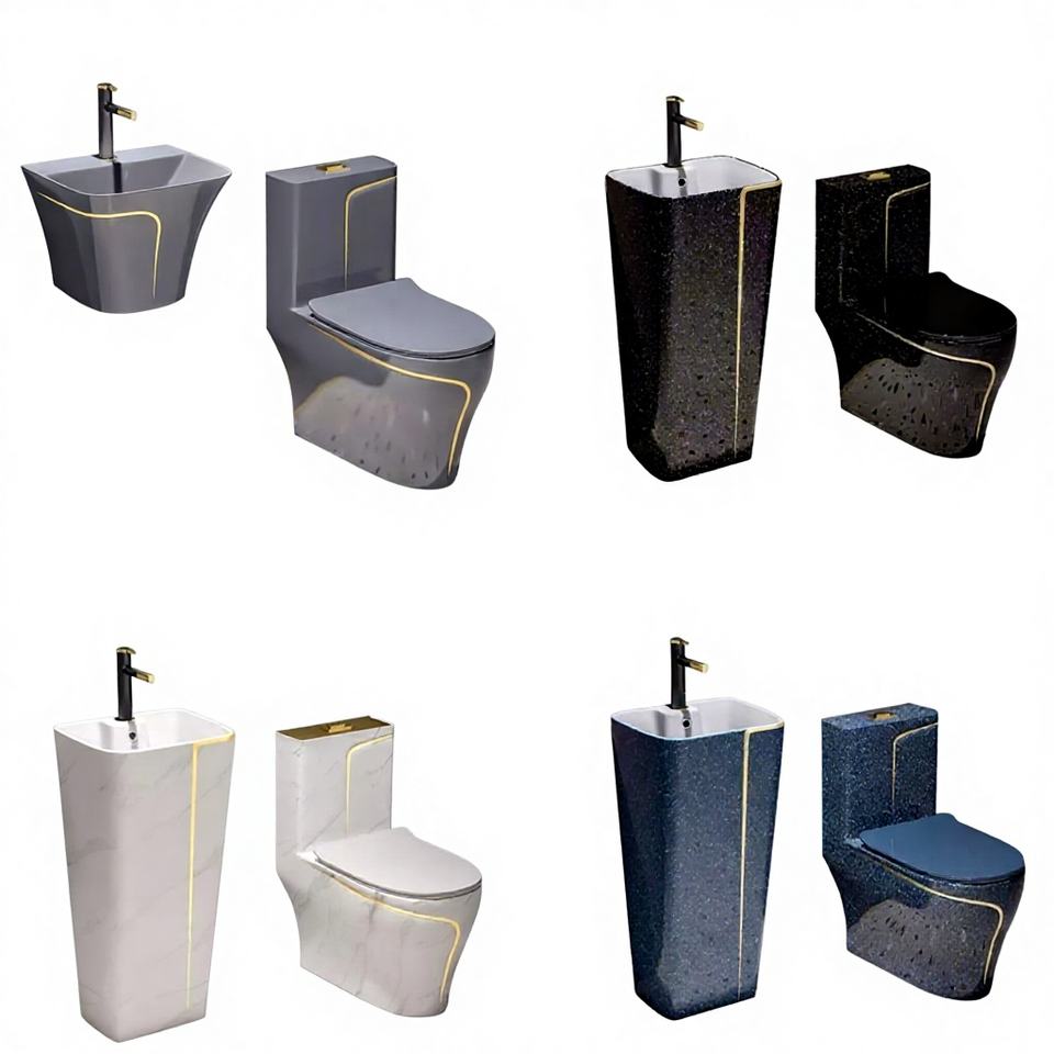 Factory Blue Luxury Floor Mounted Bathroom S-trap Ceramic Water Closet Siphon Flushing One Piece Wc Toilet and Pedestal Basin