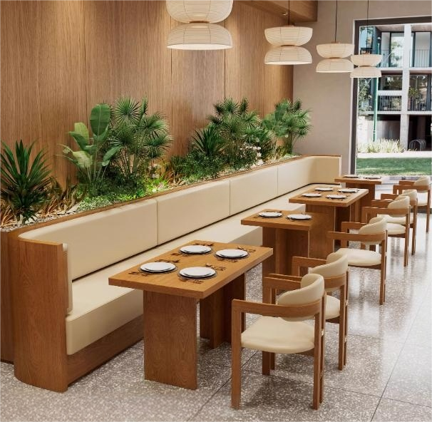 Set Tavolo-Sedie per Ristoranti su Misura, Arredamento in Legno Massello con Imbottitura per Angoli di Ristoranti/Caffè