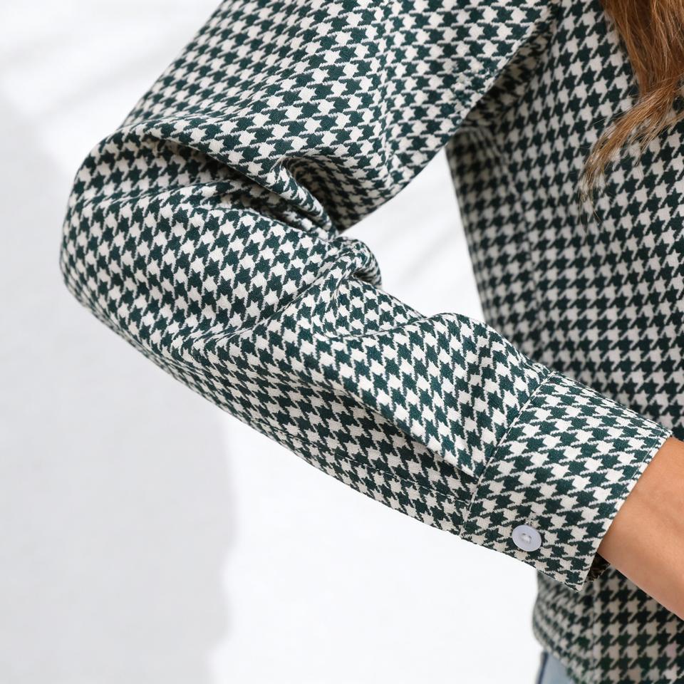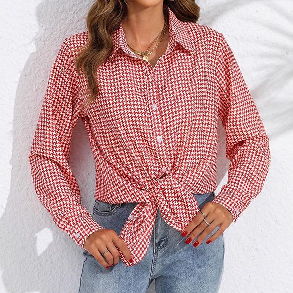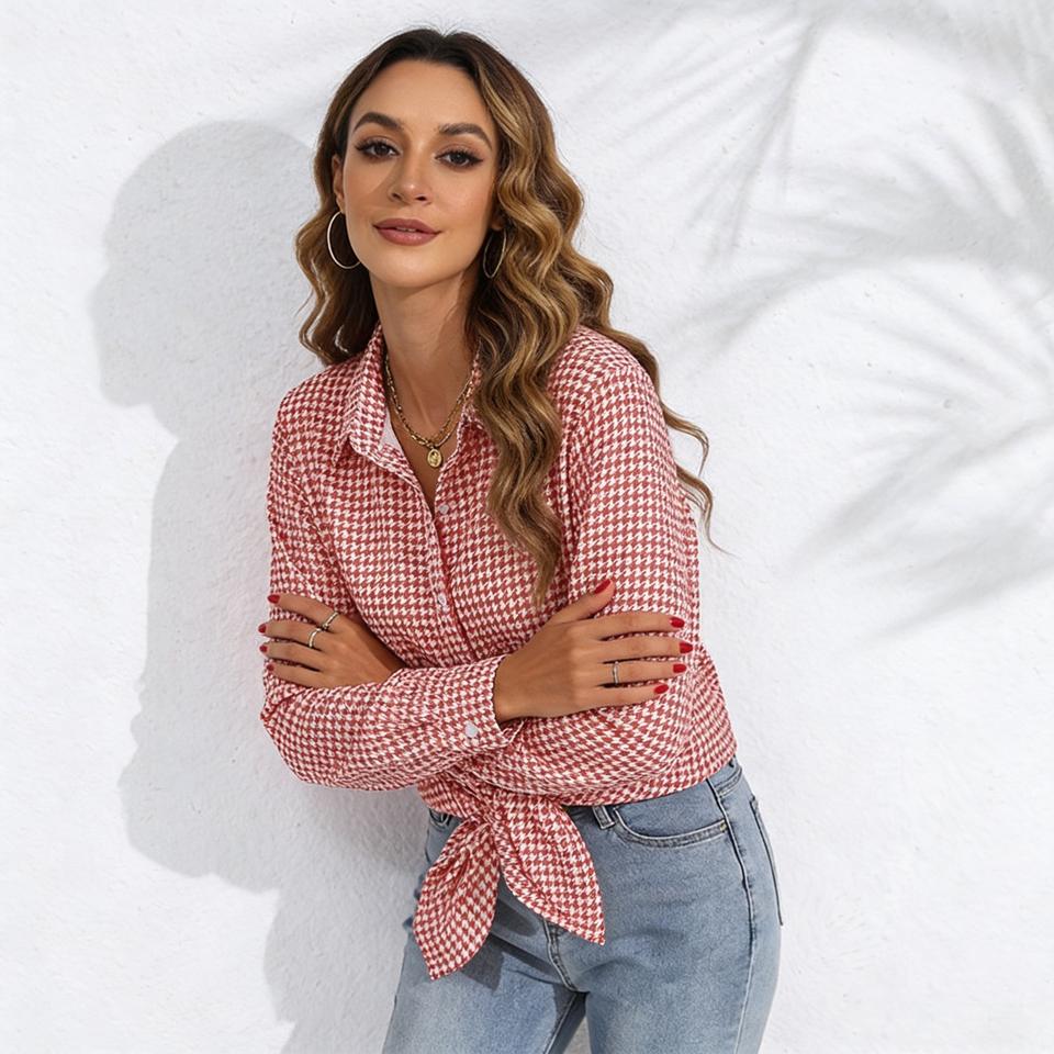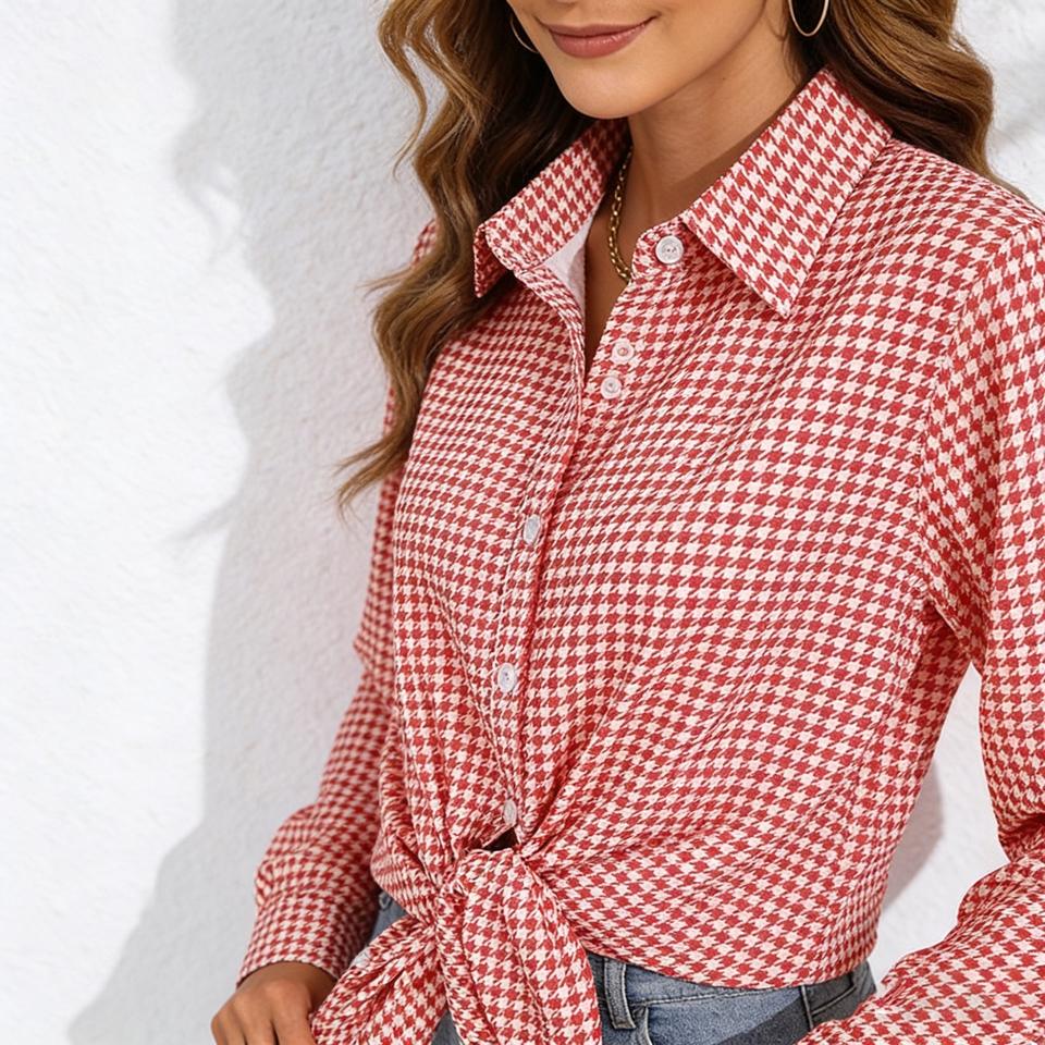 Camicetta Elegante da Donna Oversize in Poliestere con Stampa Pied-de-Poule a Maniche Lunghe per Uso Quotidiano