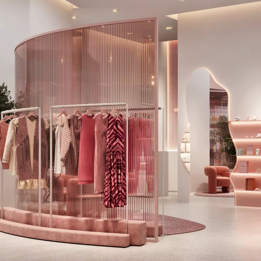 Factory Custom Soft Luxury Art Style Women's Boutique Display Stand Wood Display Cabinet with LED Lights