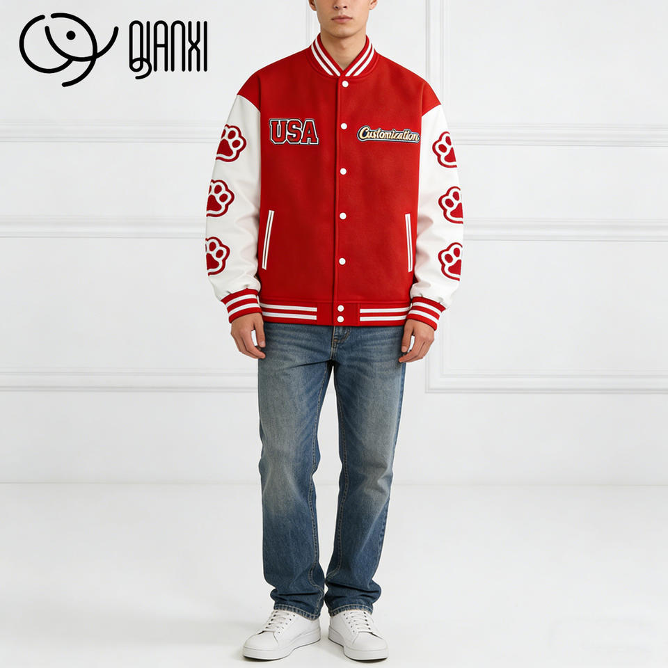 Giacca Bomber da Baseball di Qualità Premium Personalizzata dalla Fabbrica con Maniche in Pelle e Toppe Personalizzate Giacca Varsity Streetwear da Uomo