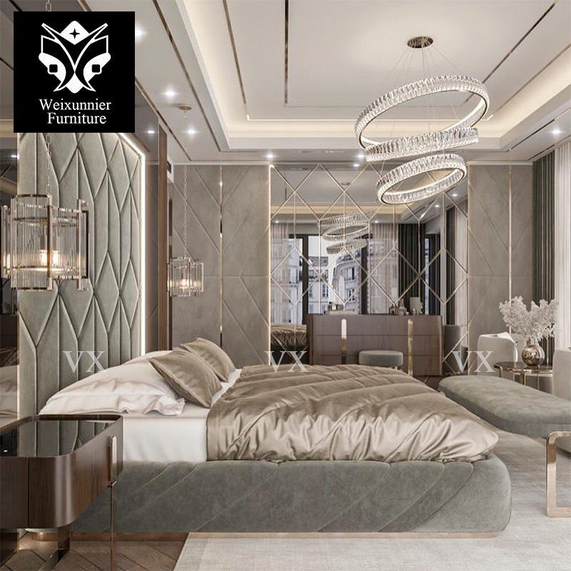 Set di camere da letto King Size personalizzato in fabbrica letto in tessuto imbottito alto testiera in acciaio inox 3 anni di lusso sfondo muro