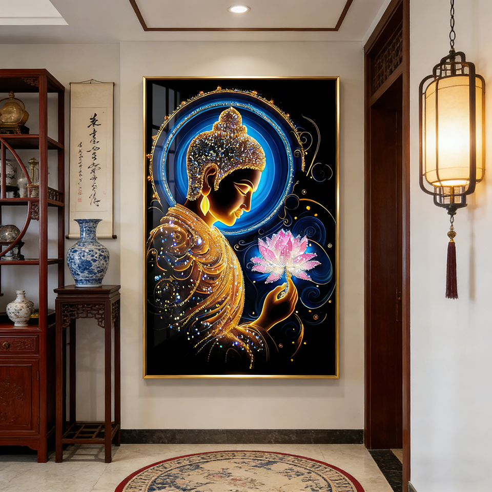 Vendita Diretta dalla Fabbrica, Grande Quadro LED da Parete per Soggiorno, Ufficio, Hotel, Paesaggio con Cornice, Statua di Buddha Blu, Dipinto in Porcellana Cristallina