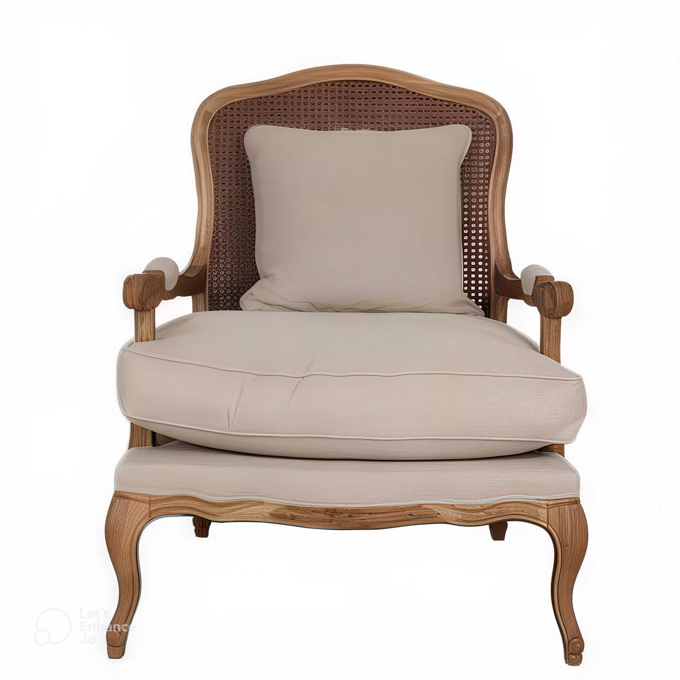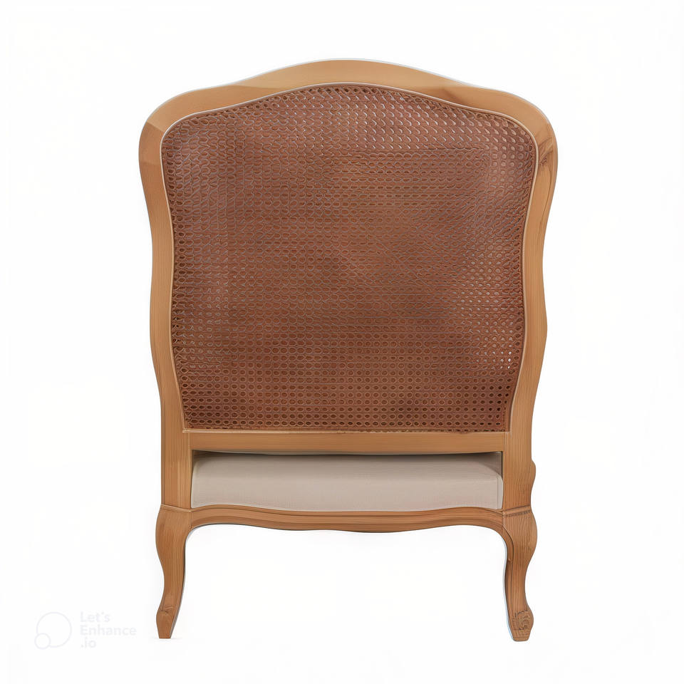 Poltrona in Legno Massello Stile Antico Francese Rustico Direttamente dalla Fabbrica con Schienale in Rattan e Rivestimento in Tessuto Beige