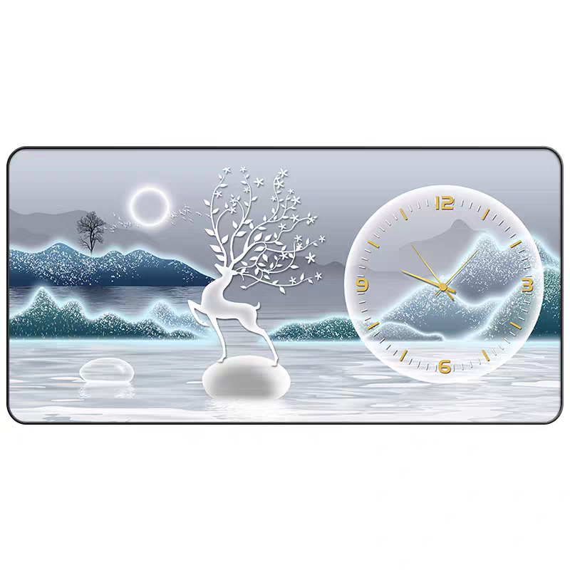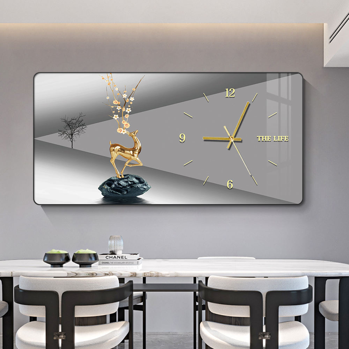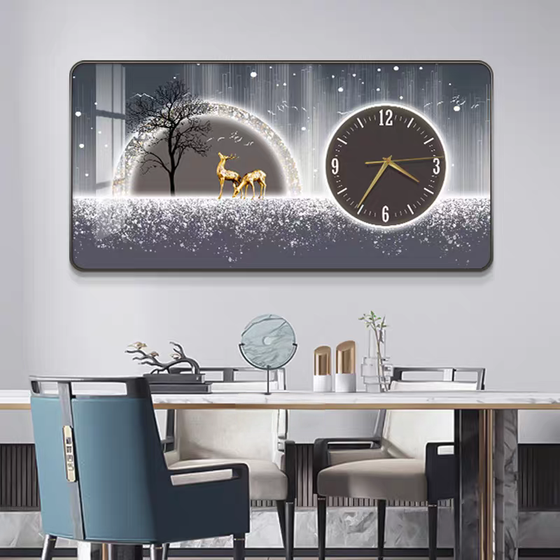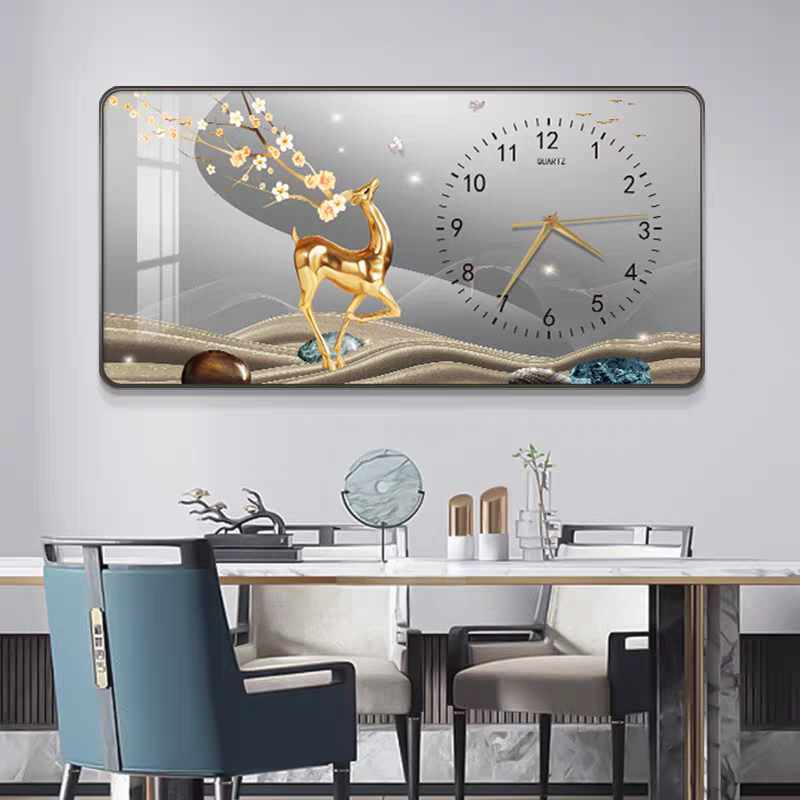 Orologio da Parete Moderno di Lusso Silenzioso, Decorazione per Ristoranti, Poster con Cornice Paesaggistica e Cervi, Dipinto su Porcellana Cristallina