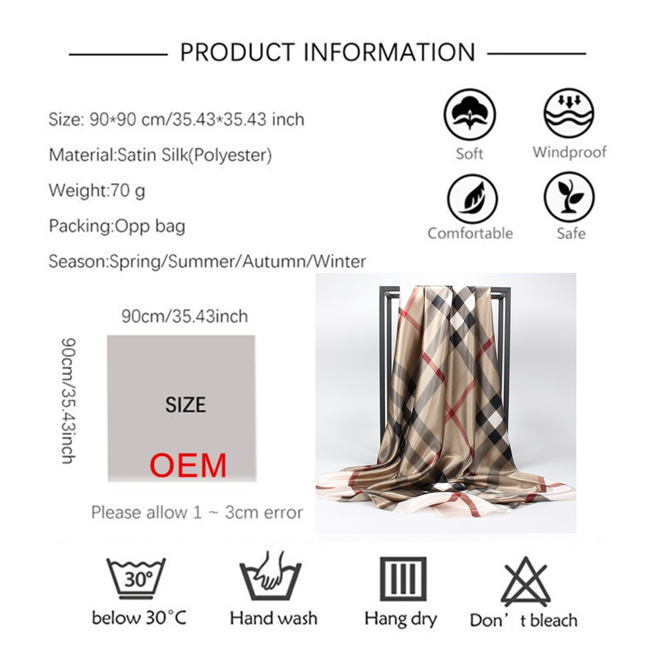 Sciarpe di Seta Stampate a Quadri Personalizzate OEM di Fabbrica per Donne, Bandana di Lusso in Raso di Seta 90cm, Hijab Quadrato Malese