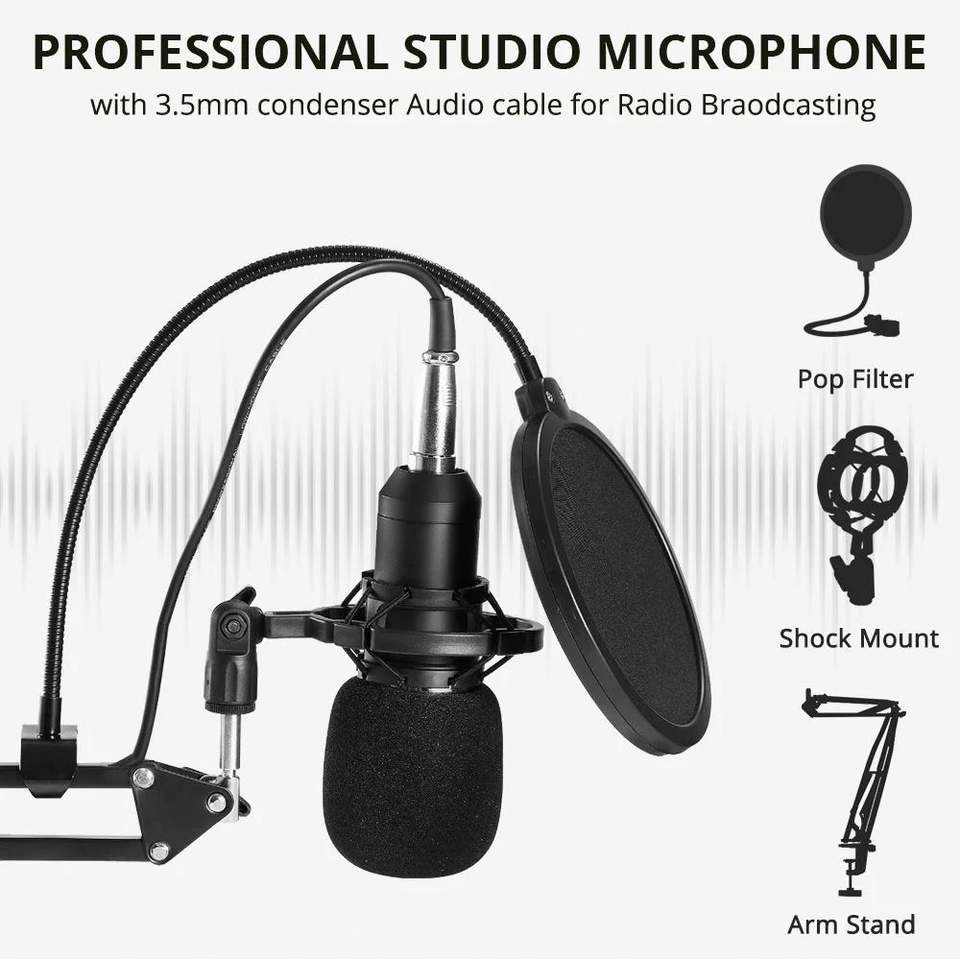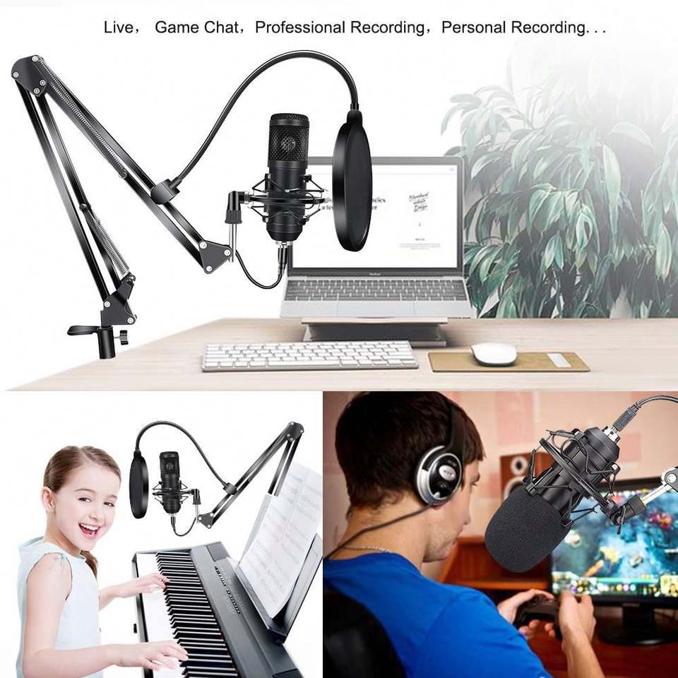 Caratteristiche:Annullamento di rumore, Luce-peso, Portatile, Microfono a condensatore, Con la Scheda Audio, Registrazione Vocale, Streaming Live, Microfono per Karaoke, Live
