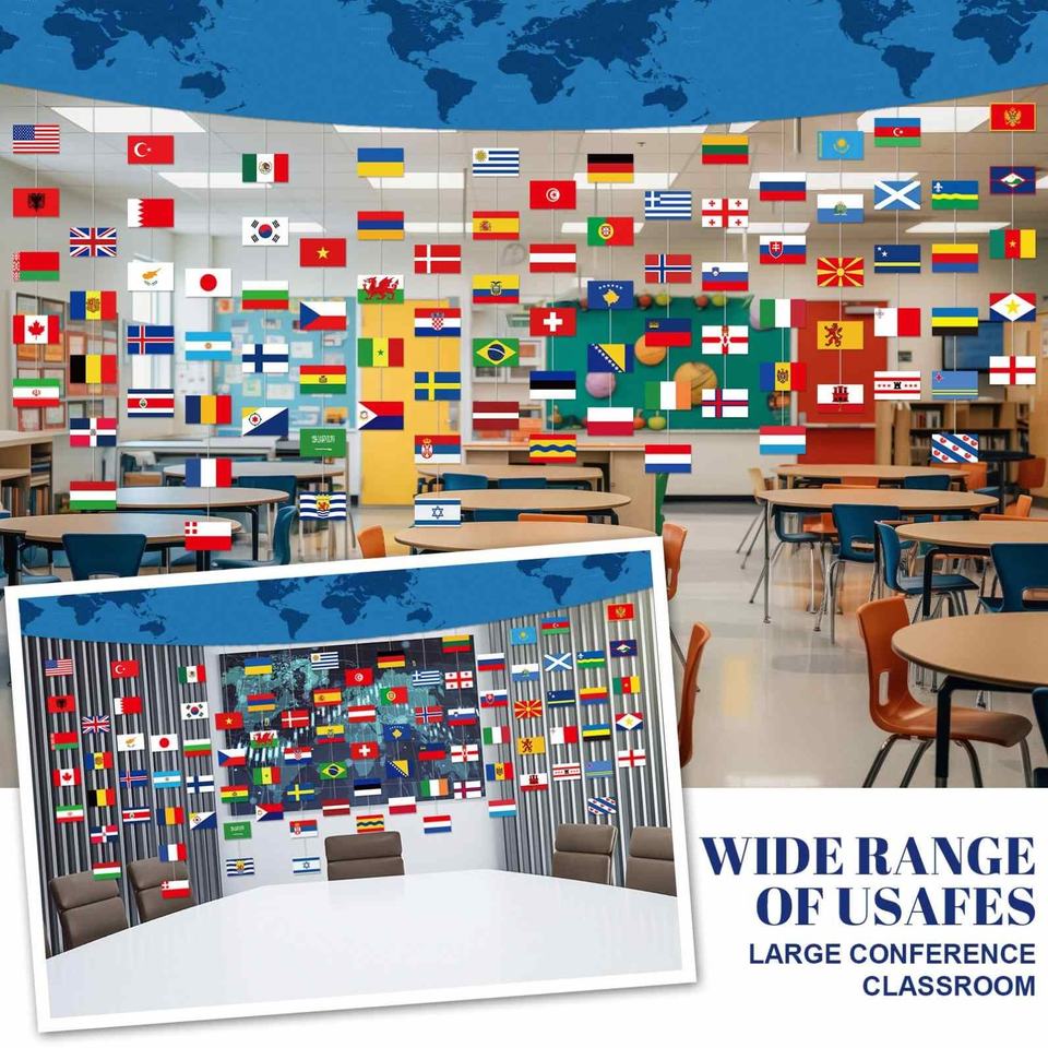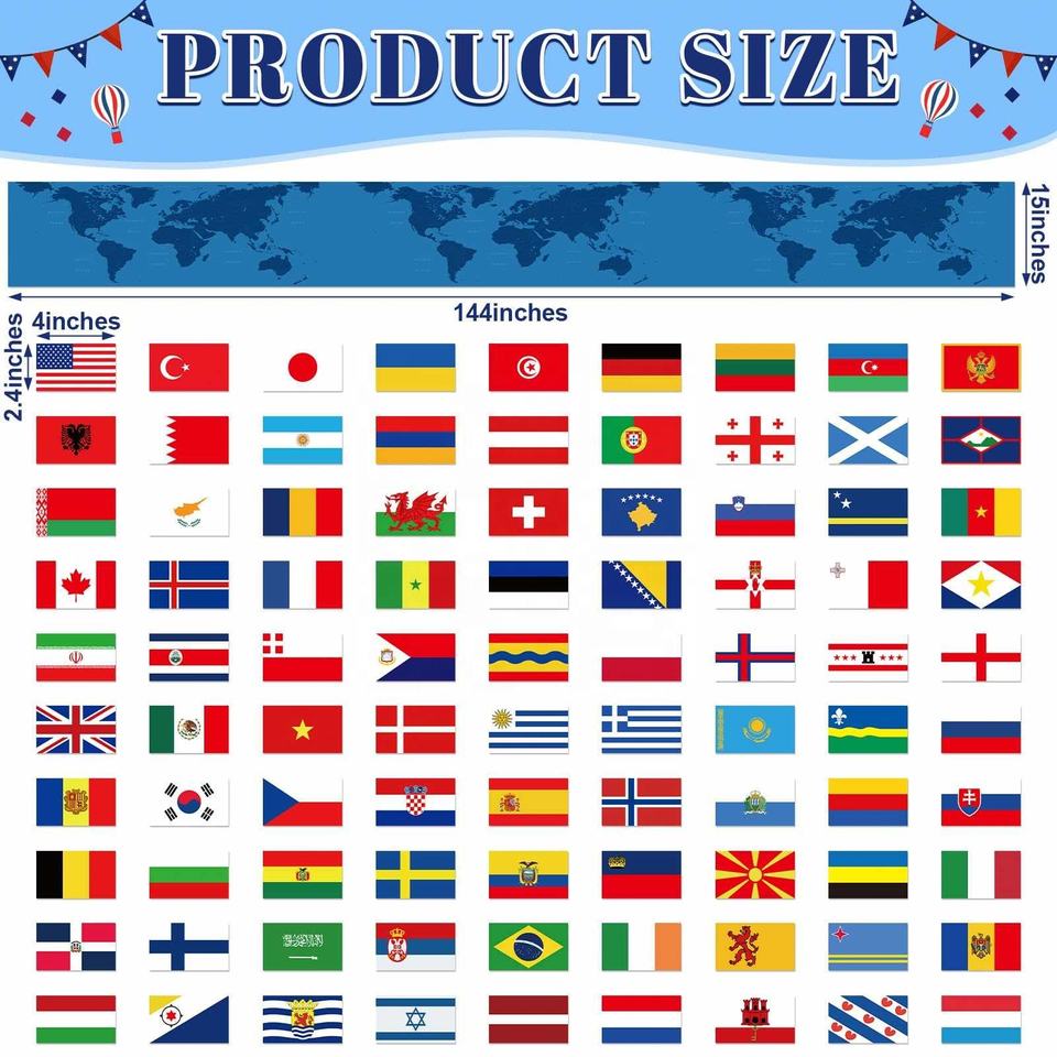 Prezzo di fabbrica decorazioni mondo giochi di calcio in poliestere tutti i paesi mappa del mondo Banner con bandiera di stringa