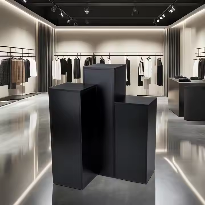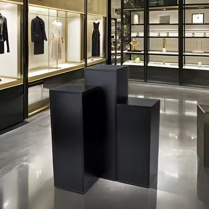 Vendita in fabbrica di montanti in legno personalizzati display nero piano cubo piedistallo basamento base del tavolo per negozio al dettaglio