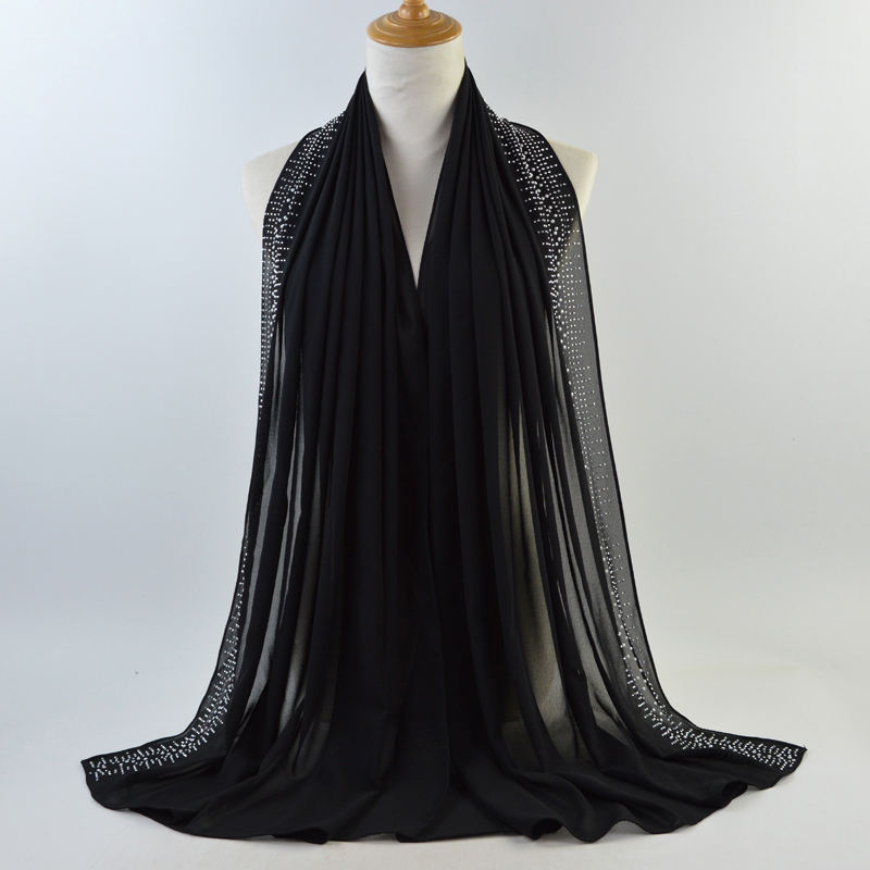 Hijab Musulmano in Chiffon Liscio con Perline Argentate e Diamanti, Copricapo da Donna
