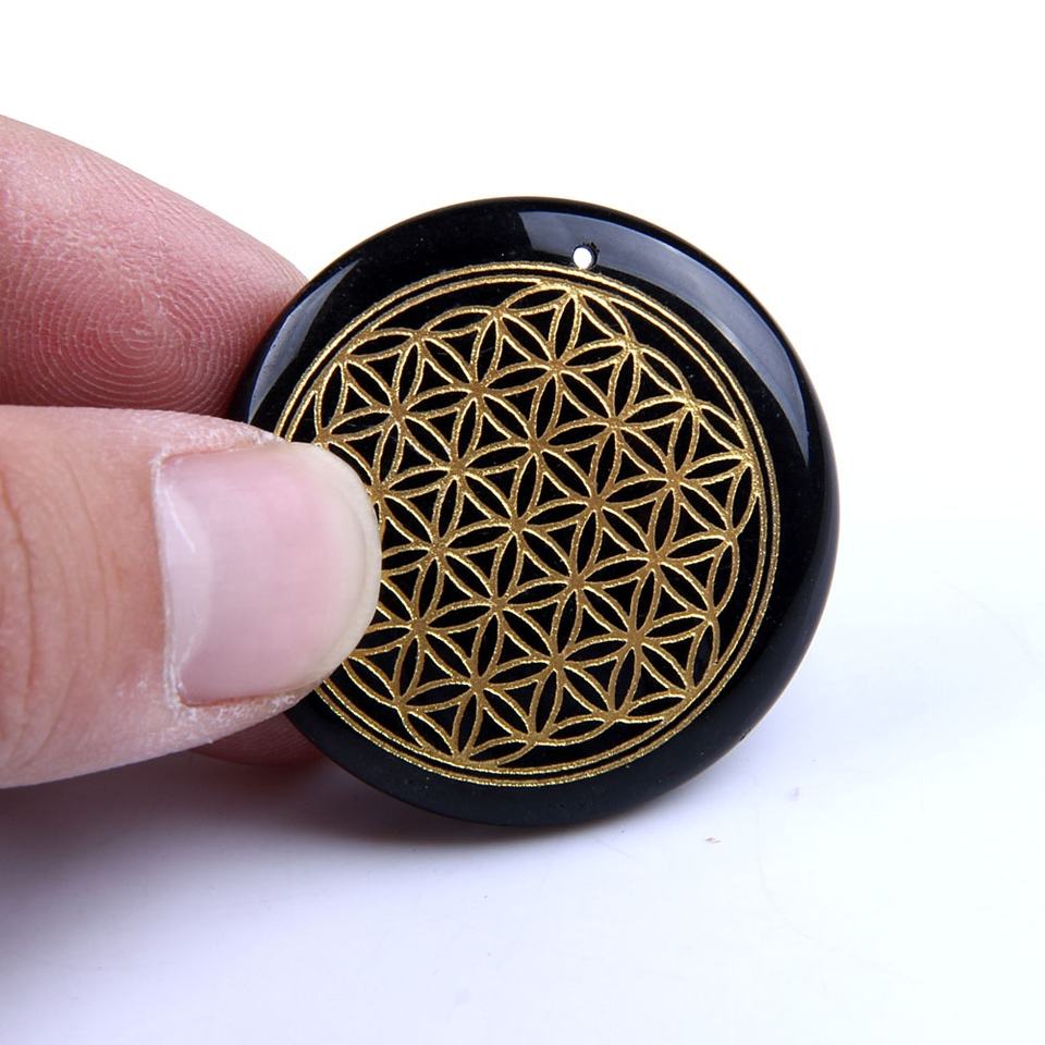 Fornitura di fabbrica nero ossidiana inciso fiore della vita all'ingrosso Chakra ciondoli