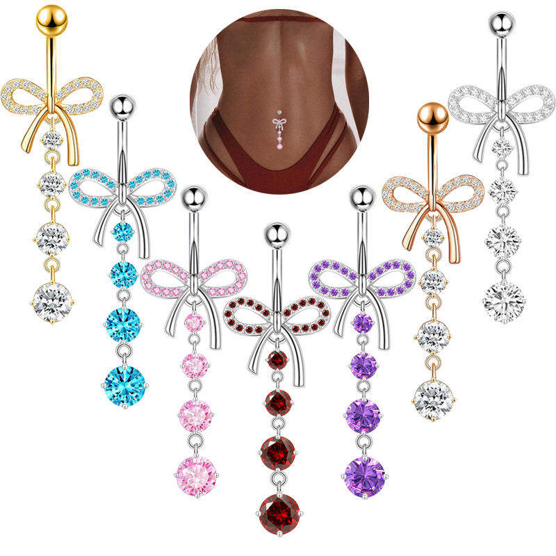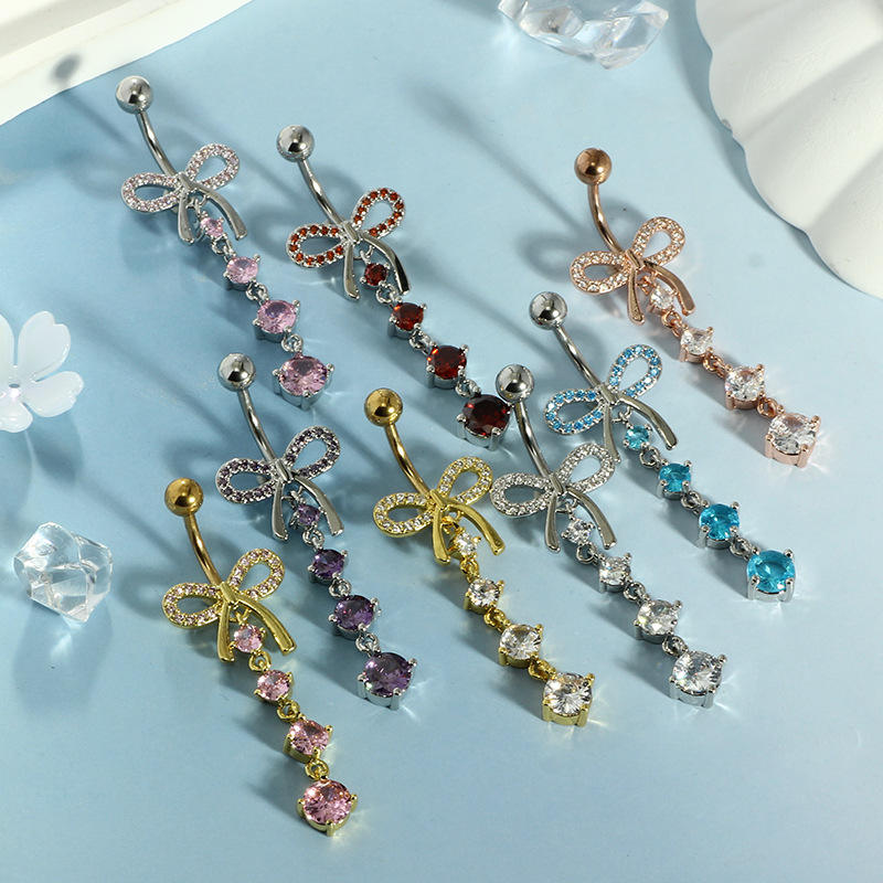 Anello da ombelico a fiocco con zirconi colorati micro-pavé placcato oro in acciaio inossidabile 316L, gioielli sexy da piercing per donna, all'ingrosso dalla fabbrica